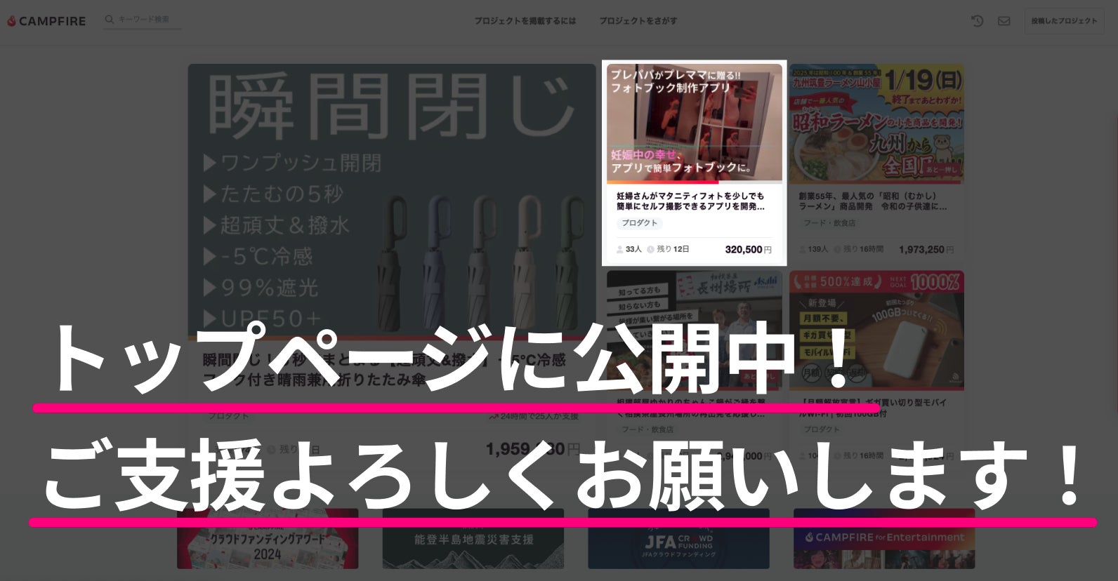 本日CAMPFIREトップページのメインエリアにプロジェクト公開中!!