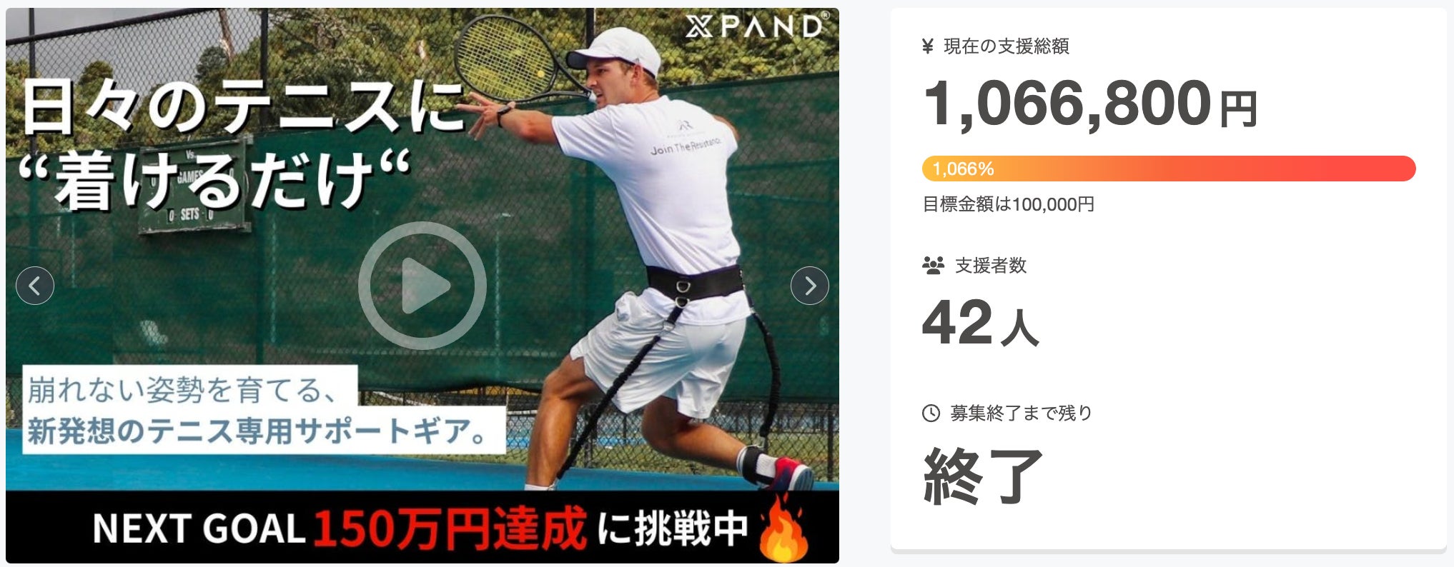 ご支援社様・ご検討中の皆々様 この度は、日々のテニスに着けるだけ!新感覚サポートギア【The Gravity Belt】 にご支援いただきまして、誠にありがとうございます! 販売開始となった、7月19日には多くの方にご支援をいただき、・公開わずか2分で目標金額を達成・公開初日でお得なセットは完売・CAMPFIRE内のスポーツカテゴリで2位、総合で9位にランクインと、素晴らしい結果を残すことができました!これもひとえに支援者の皆様のおかげでございます。ありがとうございます!クラウドファンディングは8月31日まで続きます。つきましては、より多くの方にThe Gravity Beltを手に取っていただくために、NEXT GOAL 150万円を目指します!よりよいテニス生活を叶えるためにも、皆様のご支援を心よりお願い申し上げます。ぜひ周りで、テニスをやられている方、お悩みの方がいらっしゃいましたら、その方に届くよう、SNS等で拡散をいただけますと幸いでございます!支援はこちら↓↓↓https://camp-fire.jp/projects/785266/preview引き続きよろしくお願い致します。XPAND日本公式チーム 一同