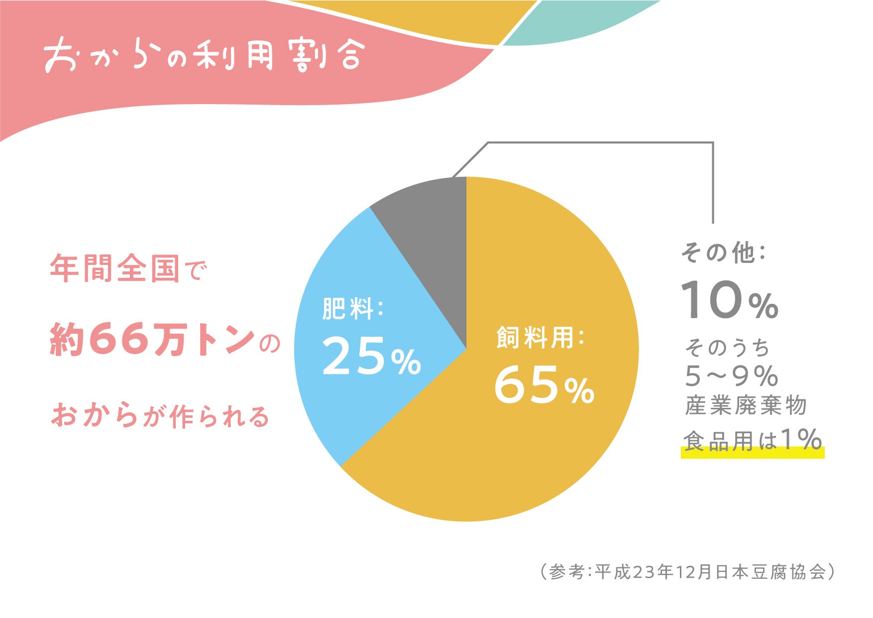 私たちが課題として感じているように、実際に全国で作られるおからのうち、食用として再利用されているのはたった1%。残りの90%は、肥料や飼料、産業廃棄物となっています。