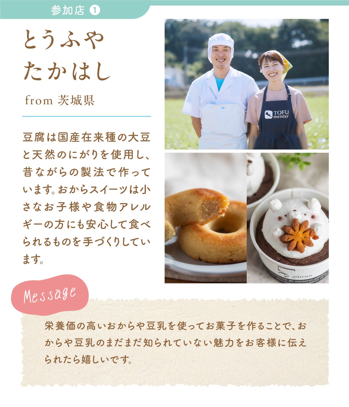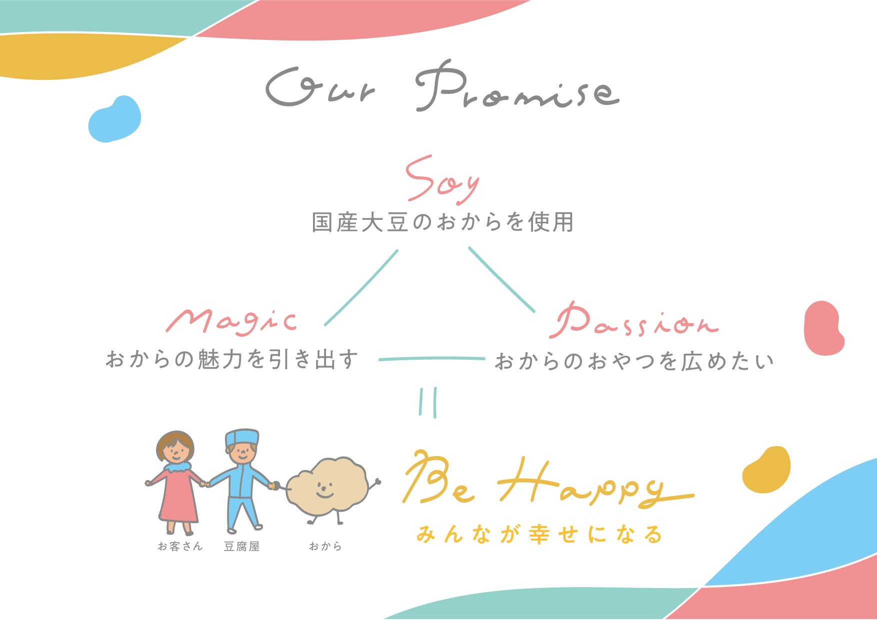 おからが美味しいスイーツになること、可能性に満ちた商品であることが広く知れ渡り、大豆を作っている農家さんも、豆腐屋さんも、豆腐を食べるお客さんも、皆がHAPPYになる世界を目指したいと思っています。
