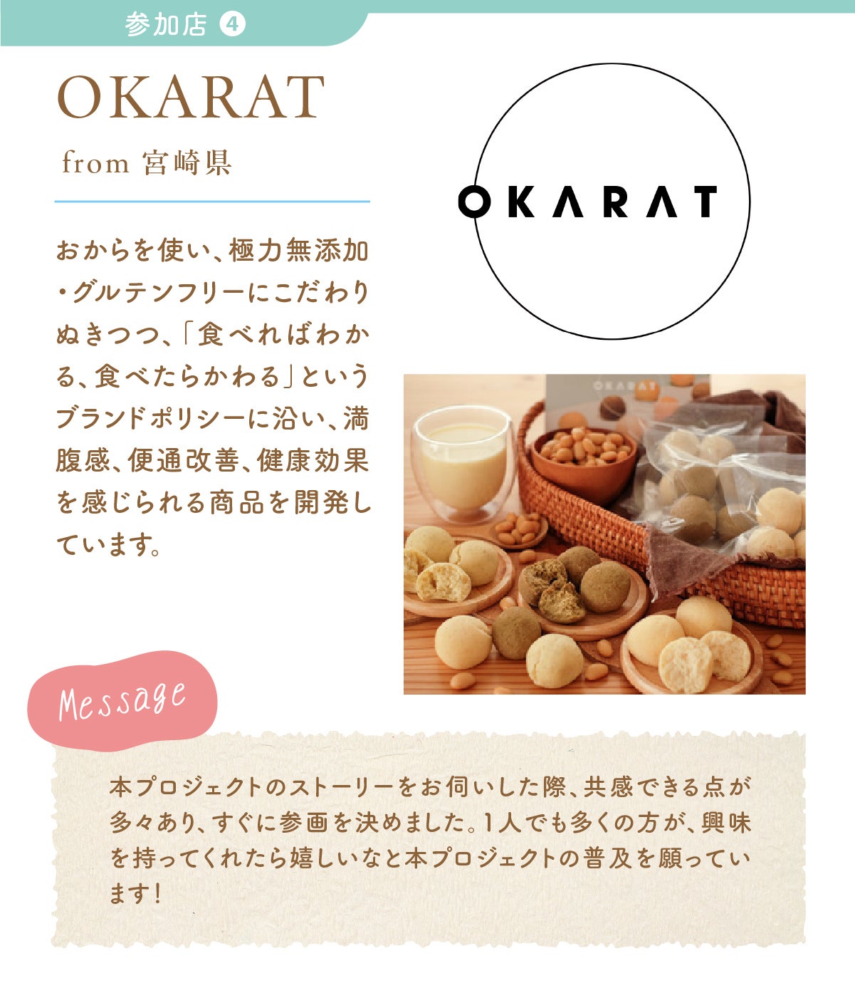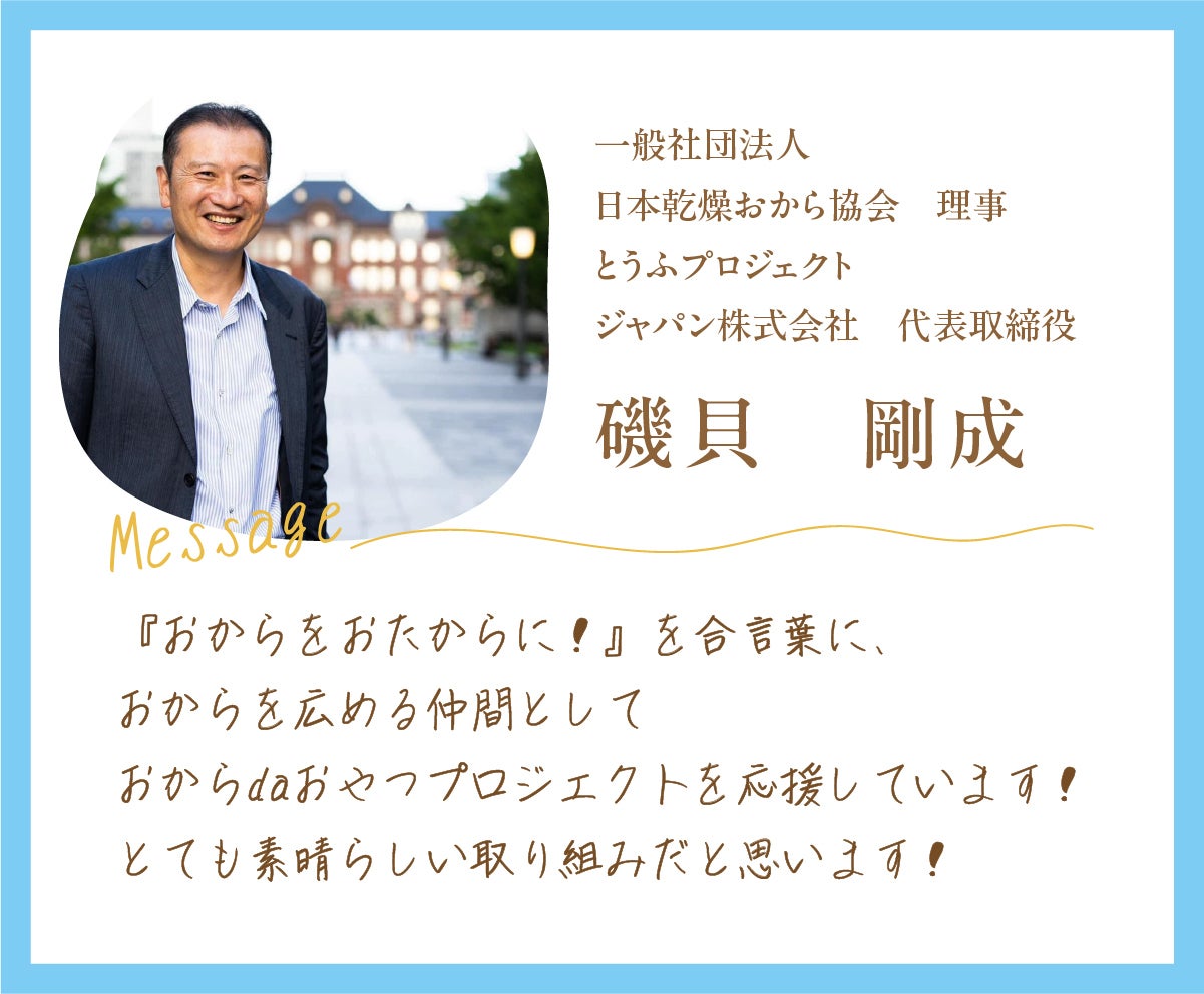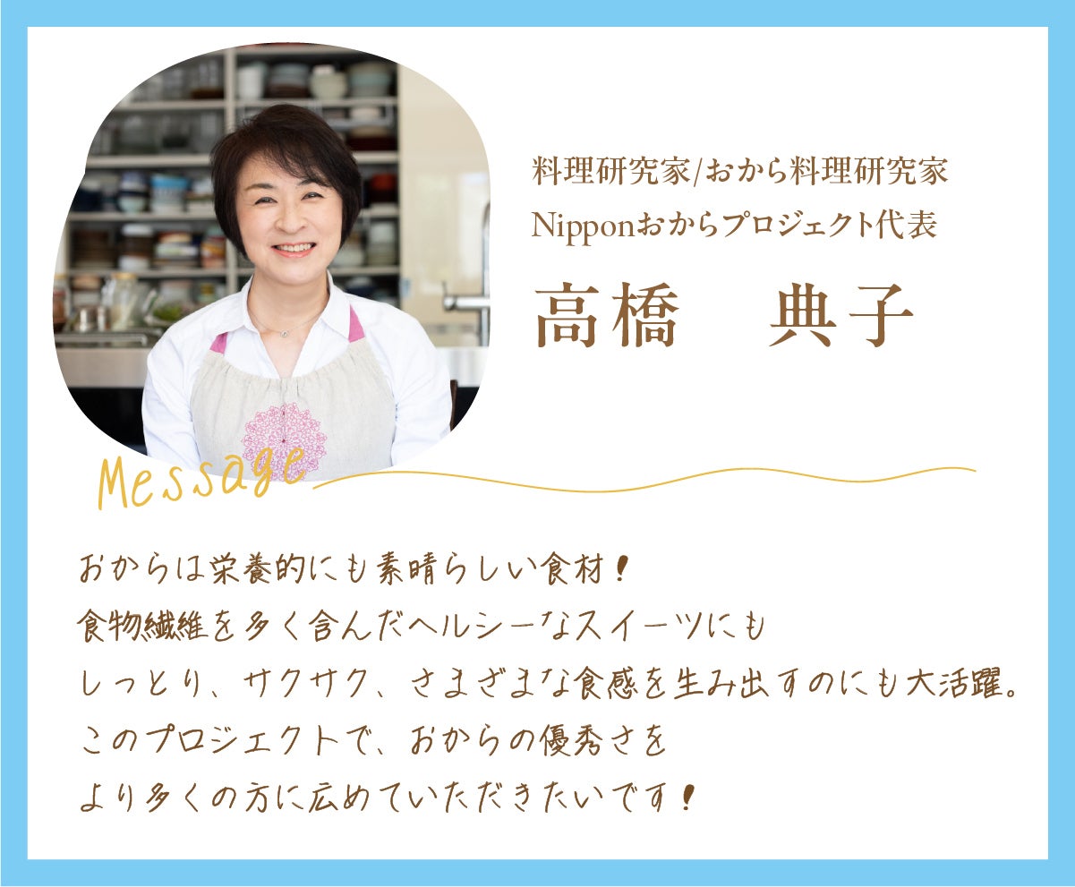 栄養豊富で体にやさしい「おから」がスイーツに生まれ変わる。プロジェクト名には「おから」の美味しさだけでなく体をいたわる優しさも付け加えたい。そんな想いを込めて『おからdaおやつ』と名付けました。