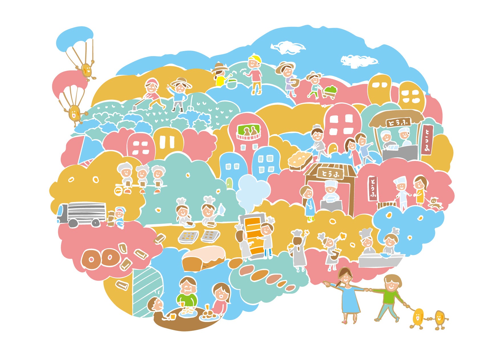 ステッカーのイラストは、大豆農家、豆腐屋さん、おからのスイーツを作る方々、食卓で食べる人々など、おからスイーツができるまでのストーリーが表現されています。
