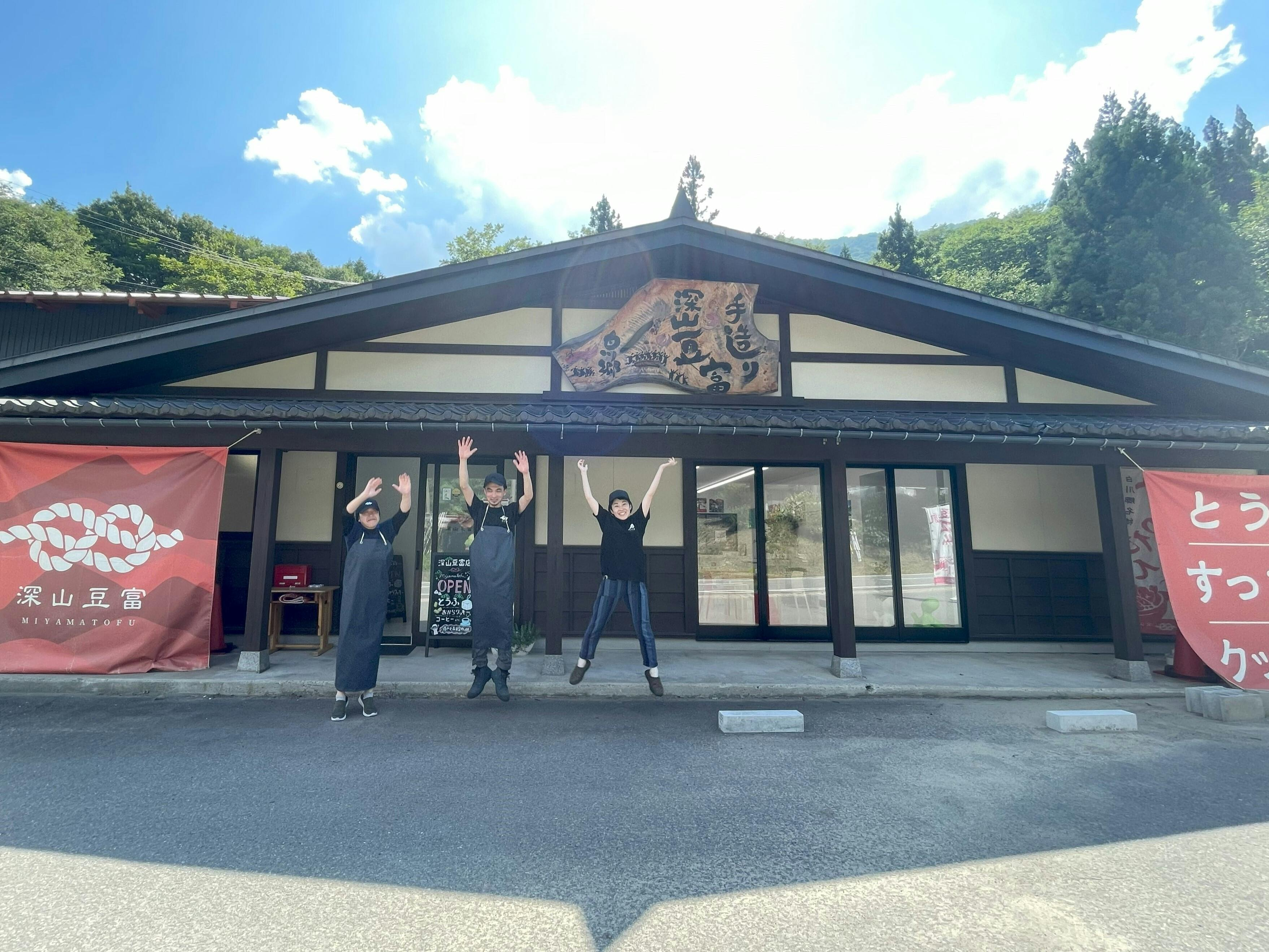 こんにちは。白川郷で伝統食「石豆富」や「すったて」の製造販売をしている深山豆富店です。ちょうど3年前の2021年に株式会社ヒダカラが先代よりお店を引き継ぎました。現在は自分たちで「豆富」「すったて」を作り、運営しています。