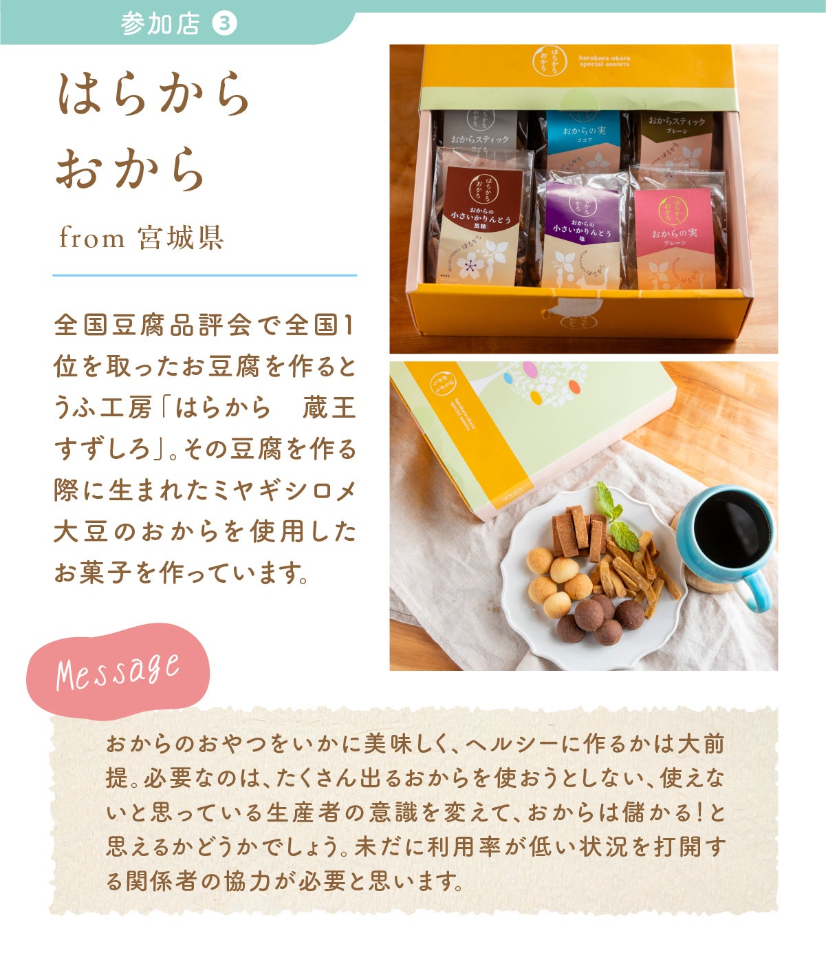そのために、まずは全国で作られているおからスイーツの美味しさを知ってもらうことが大きなスタートです。
