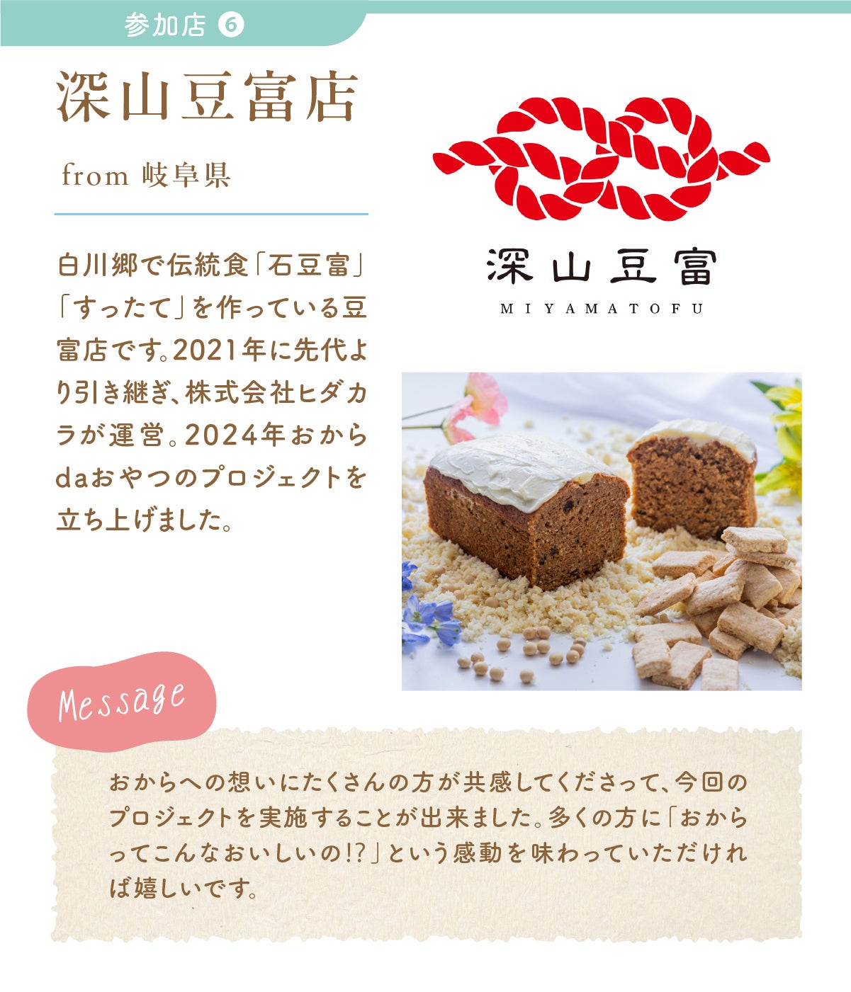 現在、深山豆富店では、「白川郷おからのまめなクッキー」と「おキャロットケーキ」を商品化し、おからの活用に努めています。
