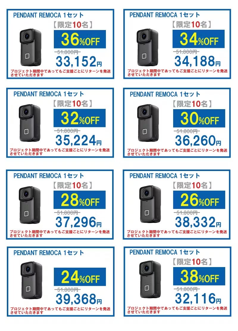 首にかけるウェラブルカメラPendant Cameraシリーズと、リモコン操作ができるカメラRemocaシリーズはこれまでのプロジェクトで、のべ5,483,618円の394人のご支援をいただきました。
