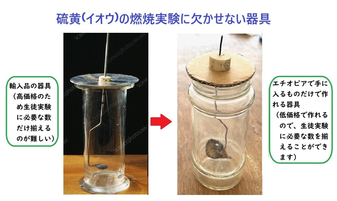 中学2年生の理科の教科書には、硫黄が燃焼しできた気体を水に溶かすとその液は酸性になるか塩基性になるかを調べる実験があります。生徒自身が実験するためには実験器具が6~7台は必要になります。しかし、ほとんどの学校にはその数だけの器具を購入することが難しいため、生徒実験はされていない状況です。教科書に書かれた生徒実験を行うためには、輸入だけに頼らないエチオピア国内で実験器具をつくる『モノづくり』が不可欠です。こどもたち自身も自分たちで器具が作れることを肌で感じることができます。日本のこどもたちは逆に実験器具が完備されているために、自分たちでも作れるという気持ちを持つ機会がなくなっているという面も感じさせられます。