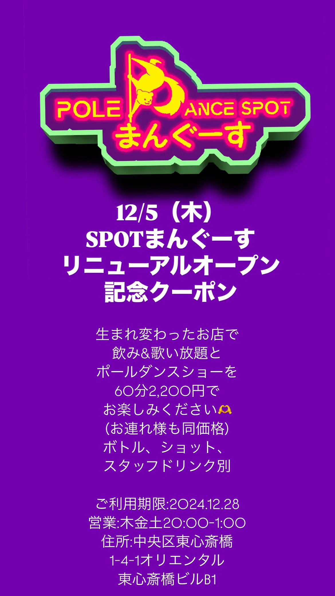 2024/11/29 13:09こんにちは、まんぐーすAYAです!まんぐーすプロジェクト最終段階只今、SPOTまんぐーすリニューアル工事真っ最中です!すべて完成するのは12月半ばになりますが、今回の改装の目玉であるU字型カウンターが無事仕上がり12/5(木)リニューアルオープンを迎えます。リターンについてご支援をいただいたみなさまへのお礼をInstagramSPOTまんぐーすのストーリーズに掲載しました!ハイライトに固定しておりますので是非ご覧ください。@spot.mangus来店チケット、オリジナルグッズのリターンについてはもう少々お待ちください。ミラノ、新スタジオ開設、ポールダンスBAR改装工事をやり切ることができたお祝いとしてご支援くださったみなさまに感謝を込めてお得な優待クーポンをプレゼントします。60分飲み放題2200円ショーチャージ込お連れさまも同料金/要ご予約よろしければ是非ご利用ください。ご来店時に必ずスタッフに添付画像を掲示ください。年内の通常営業は毎週木金土+25日(水)20-1時/使用期限12/5〜28/優待クーポンご利用1回限りみなさまにお会いできることを楽しみにしています。どうぞよろしくお願い申し上げます。 もっと見る