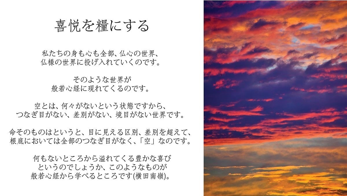 また英語版も制作し、オンラインで発信させていただき、東洋思想の伝統から発する、とらわれない心のあり様が国境を越えて、空のように広がって行くこと。世界の多くの人々が、苦から解放されると同時に、万物同根の一体感につながることができれば、本望に存じます。