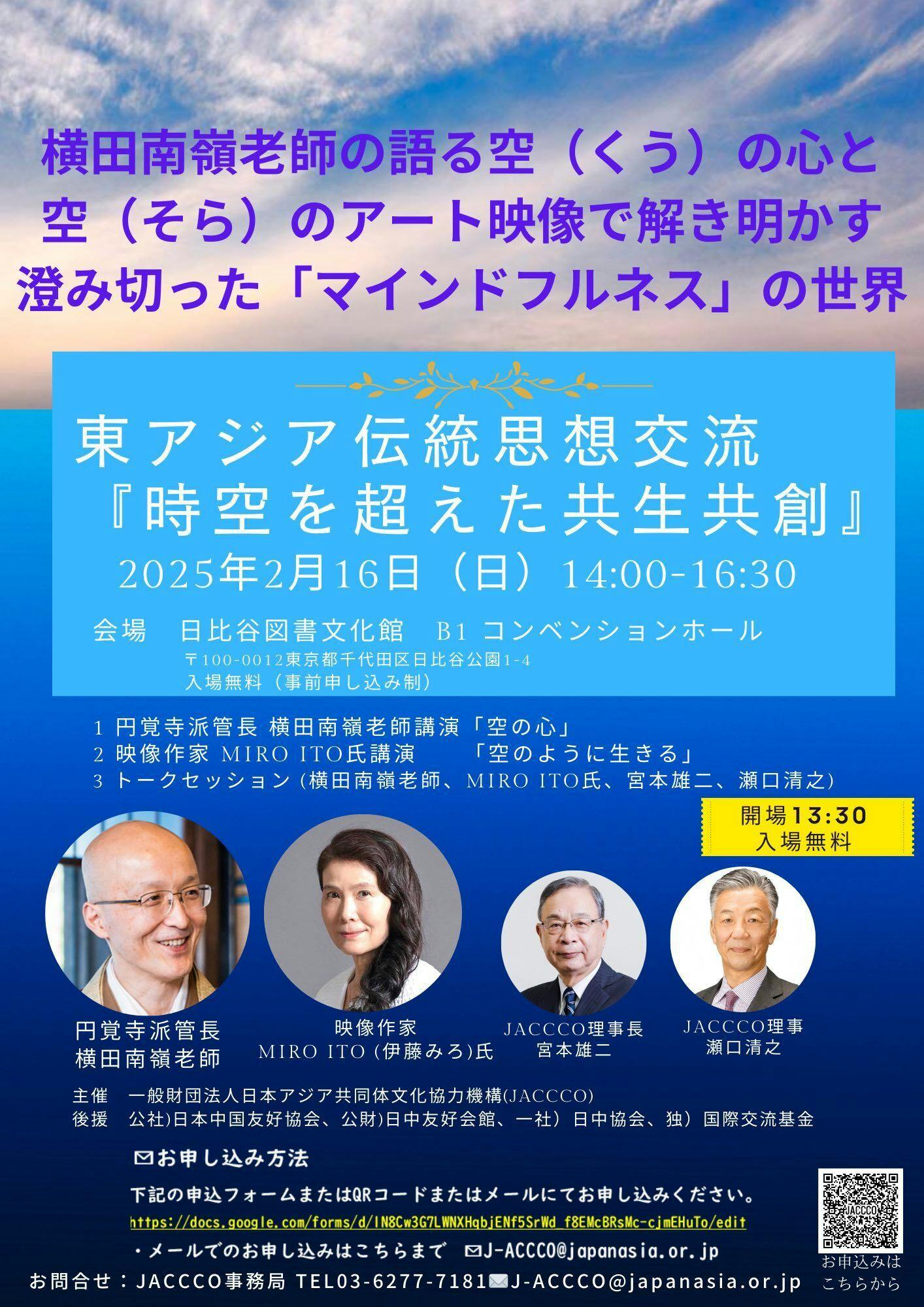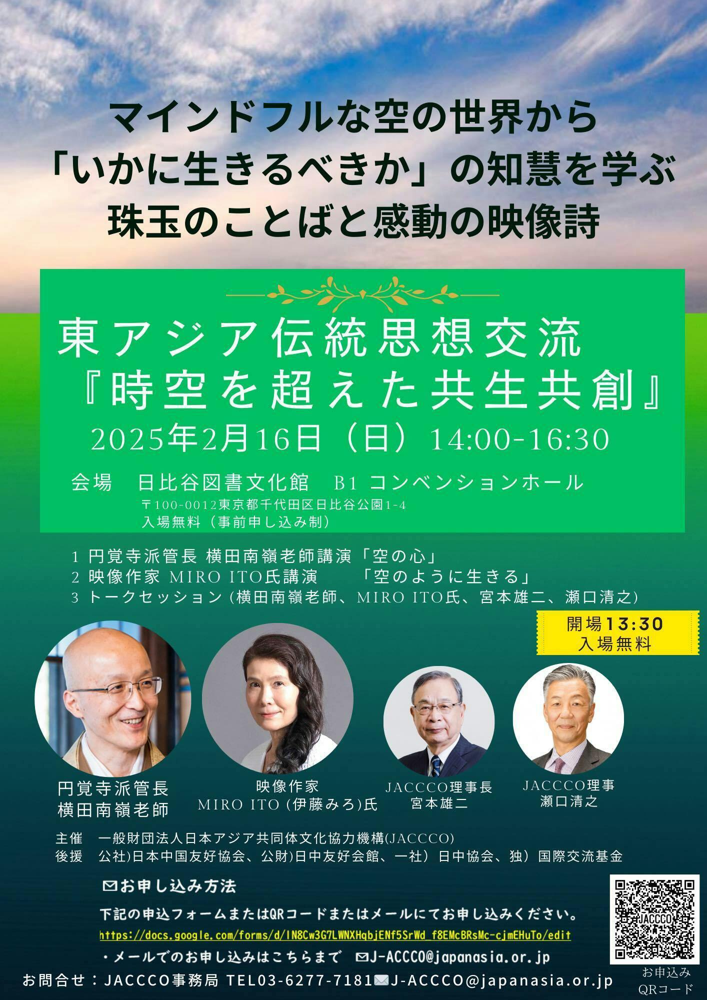 2025/02/11 09:29円覚寺管長の横田南嶺老師の「空(くう)」を語ることばと、MIRO ITOの空(そら)のアート映像を組み合わせ、国境や差別のない、世界の一体性への願いとともに、「いかに生きるべきか」のメッセージを分かち合う、映像詩「空のように生きる」がいよいよ発表・上映されます。その節は、皆様からのご協力を賜り、誠にありがとうございました。今一度、心より厚く御礼申し上げます。さて2025年2月16日(日)日比谷図書文化館での講演イベント「時を超えた共創共生」の前半では、横田老師の「空(くう)」の心についてのお話の後、MIRO ITOによる解説と映像詩「空のように生きる」をご鑑賞いただきます。後半では、元駐中国日本大使の宮本雄二大使、国際政治の論客・瀬口清之氏を交え、激動の時代にあって、「空観(くうがん)」を通した「マインドフルネス」の意義や、東洋思想の伝統を、生きる上でどう活かすか、ディスカッションを行います。 私たちにとって、最も身近にあり、誰もが平等に見上げることができ、境目のない空(そら)を通して、「空(くう)」の本質である「とらわれない」「こだわらない」「分けない」という叡智を学び、いのちのつながりへの思いを共有するイベントです。まだ残席がございますので、皆様のご来場をお待ち申し上げます。*************************開催日時:2025年2月16日(日)14:00~16:30 会場:日比谷図書文化館B1 コンベンションホール住所:東京都千代田区日比谷公園1-4入場無料(事前申し込み制)定員200名主催者:一般財団法人日本アジア共同体文化協力機構(JACCCO)************************【内容】講演:円覚寺派管長・横田南嶺老師「空(くう)の心」講演:MIRO ITO(伊藤みろ)映像詩「空のように生きる」上映と解説パネルディスカッション:宮本雄二・元駐中国日本大使・JACCCO理事長、瀬口清之JACCCO理事、横田南嶺老師、伊藤みろ Miro Ito***********************【お申し込み方法】電話・03-6277-7181Eメール:J-ACCCO@japanasia.or.jpネットでのお申込みは以下のURLより:https://docs.google.com/forms/d/e/1FAIpQLSeze5seSwkMehkG0PZVLJ7JP6CNHX78-laXdU-KShRGzVMCHQ/viewform?pli=1&fbclid=IwY2xjawIXd05leHRuA2FlbQIxMAABHb0FCMlKFBTq-WdfC1SwFROAsWXf0VbTCkHYzRSuo8a9mNdUdYIwhlzf7w_aem_cWI3gNfyK9u5hVUfwX_wtg もっと見る