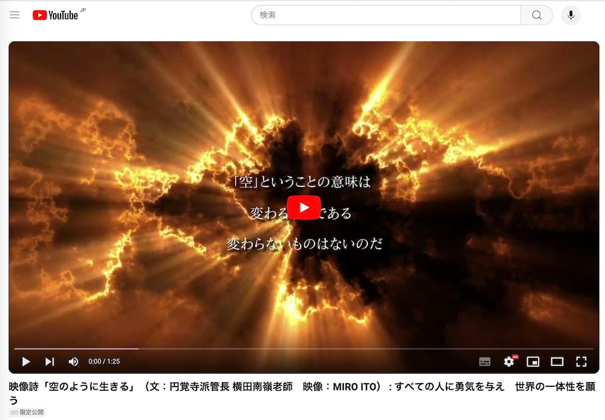 本映像作詩「空のように生きる」は、大乗仏教の根本思想である「空 (くう) 」の教えを、空 (そら) の広大さと包容性、絶え間なく移ろう自由な姿と重ね合わせる映像作品です。