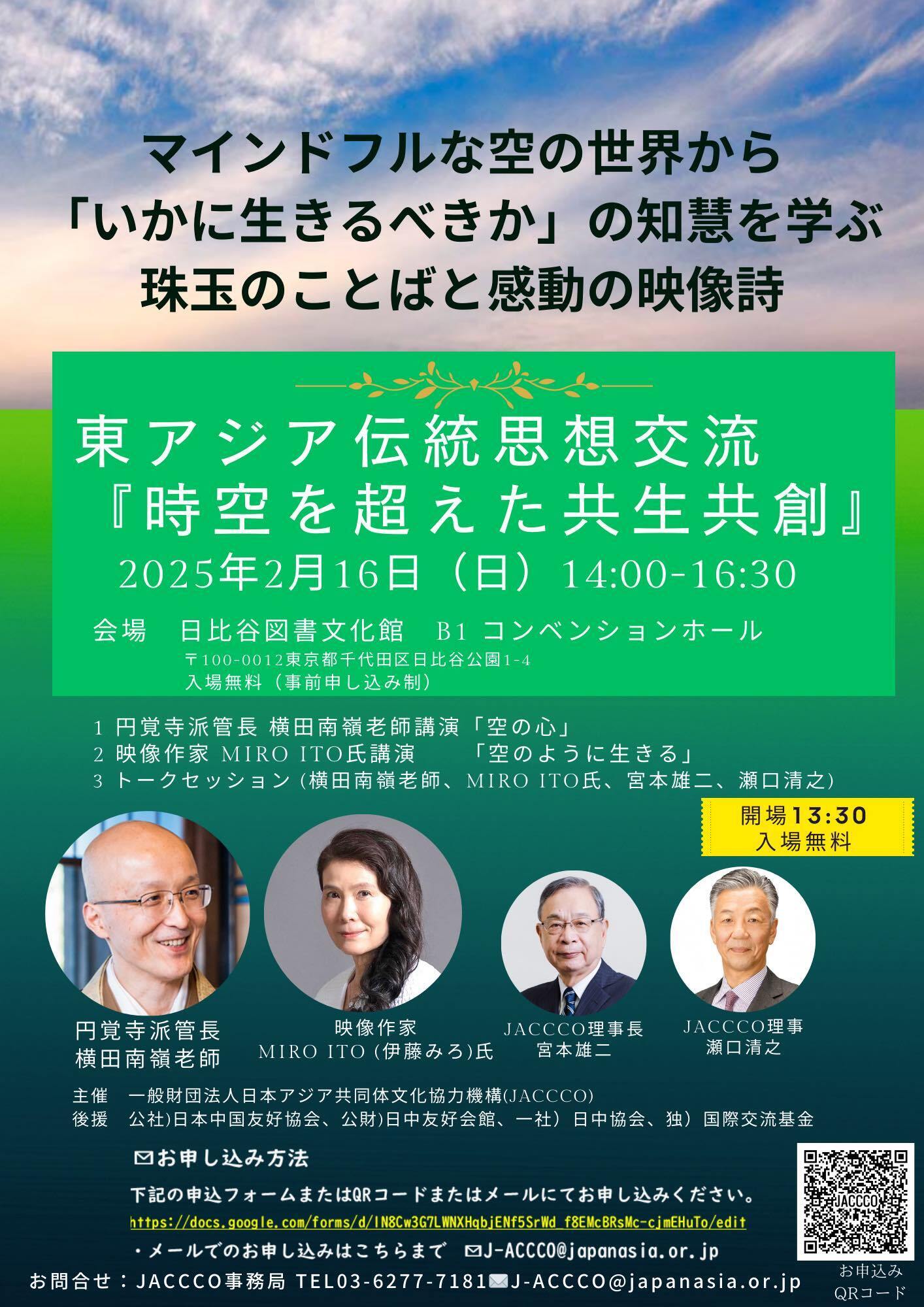 さて2025年2月16日(日)日比谷図書文化館での講演イベント「時を超えた共創共生」の前半では、横田老師の「空(くう)」の心についてのお話の後、MIRO ITOによる解説と映像詩「空のように生きる」をご鑑賞いただきます。
