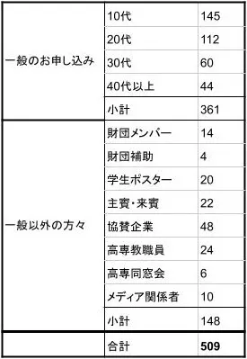 参加人数は以下の表の通りで、OB・OGが中心の会とは思えないほど10代20代の参加者が多い傾向にありました。