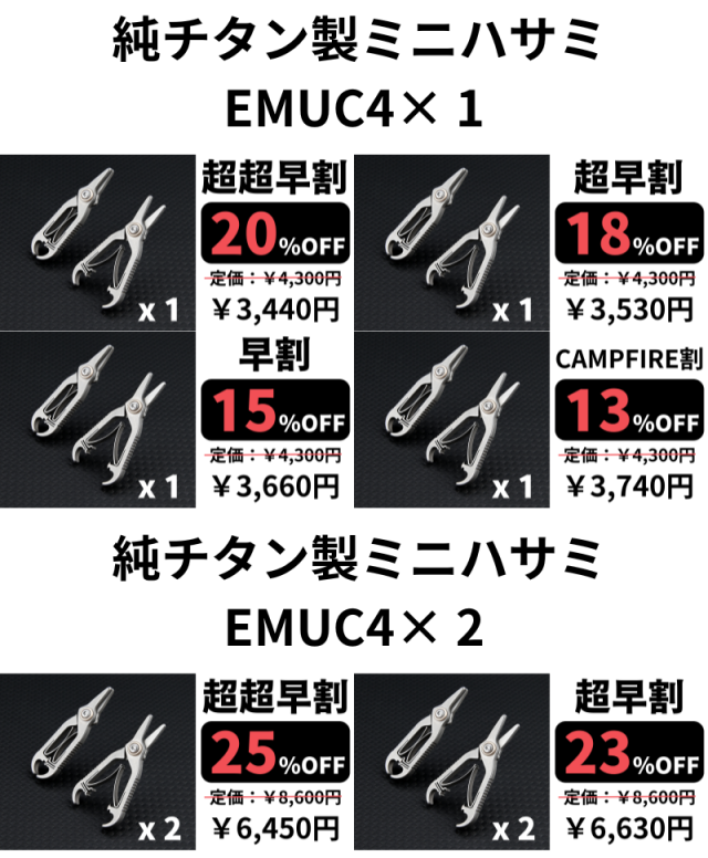 2024/11/22 18:14皆様こんばんは。株式会社Emu-One の工藤です。弊社の新規プロジェクトをご紹介いたします。 片手で一秒開閉!純チタン製キャロットナイフで大人にも夢中になれる、実用性も抜群↓プロジェクトページはコチラ↓https://camp-fire.jp/projects/811595/preview11月23日(土)18時よりCampfireにて予約販売を開始いたします。特徴:❶ 毎日使いに最適な純チタン製でミニマムサイズで切れ味も抜群。❷ 手首を軽く動かし、重力を少し加えて遊ぶキャロットナイフは、手先の運動や気分転換に最適。❸ わずか38gの軽さと折りたたみ式で持ち運び便利。いつでもサッと取り出して使える。ぜひ、一度プロジェクトページをチェックしていただければ幸いです。 片手で簡単に刃の開閉ができ、頑丈かつ軽量で、しかも切れ味抜群です。「EMUC5」は手のひらサイズで持ち運びやすく、段ボールの解体や釣り、キャンプでも大活躍!普段の生活からアウトドアまで幅広く使える万能ミニナイフです。↓プロジェクトページはコチラ↓https://camp-fire.jp/projects/811595/preview皆様の応援&ご支援心よりお待ちしております。 もっと見る