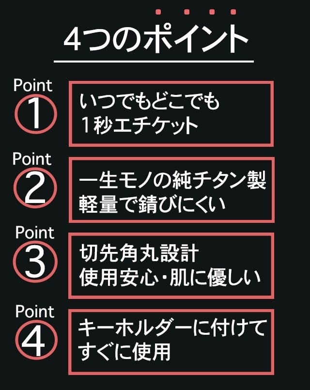 純チタン素材使用で重量わずか5gのミニハサミで、いつでもどこでも、ラクラクエチケット処理できるほか、ハサミとしても活躍します。