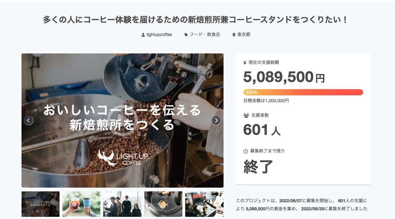 2022年には焙煎量を増やすべくCampfireにてクラウドファンディングを実施させていただきました。ありがたいことに600名以上の方にご支援いただき目標額508%を達成し、無事2023年9月に東京 三鷹に新焙煎所をオープンいたしました。