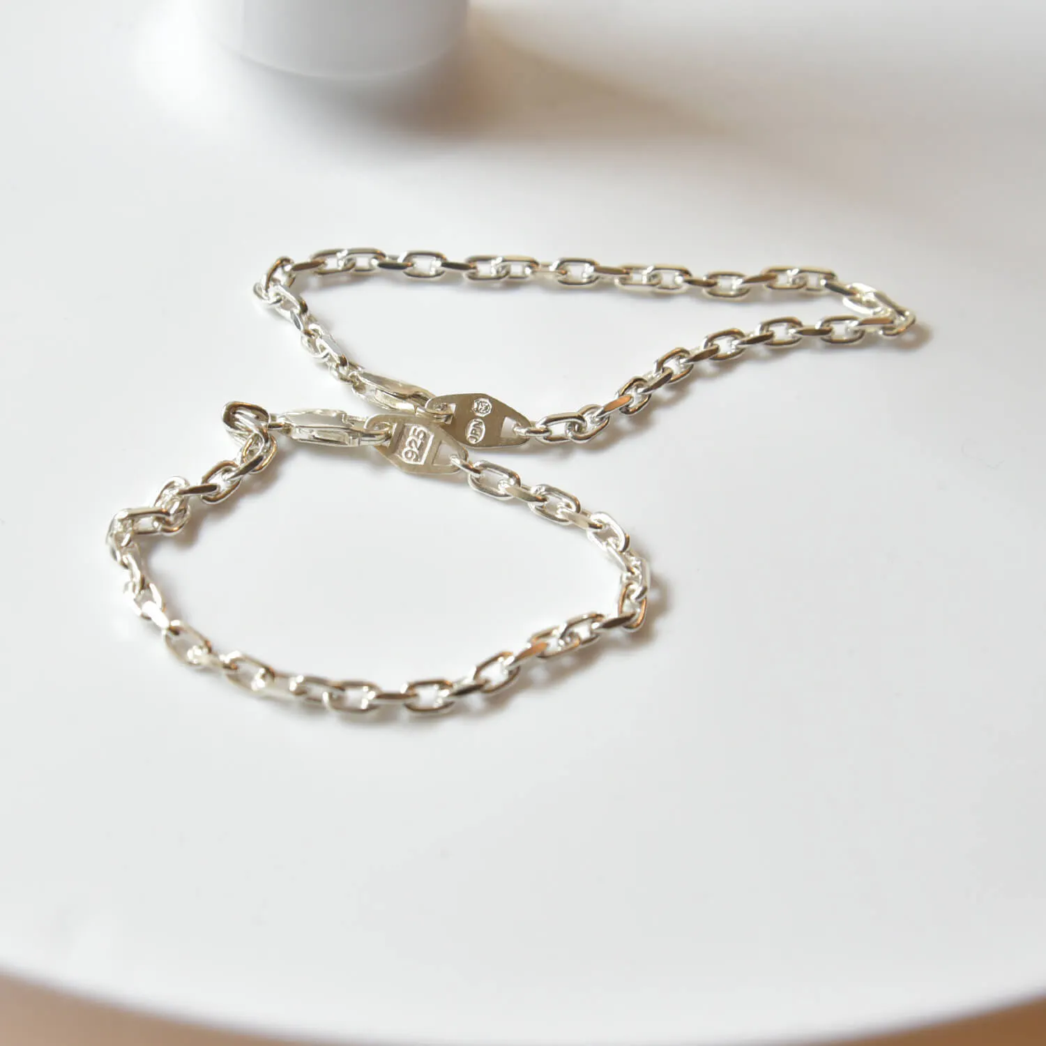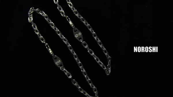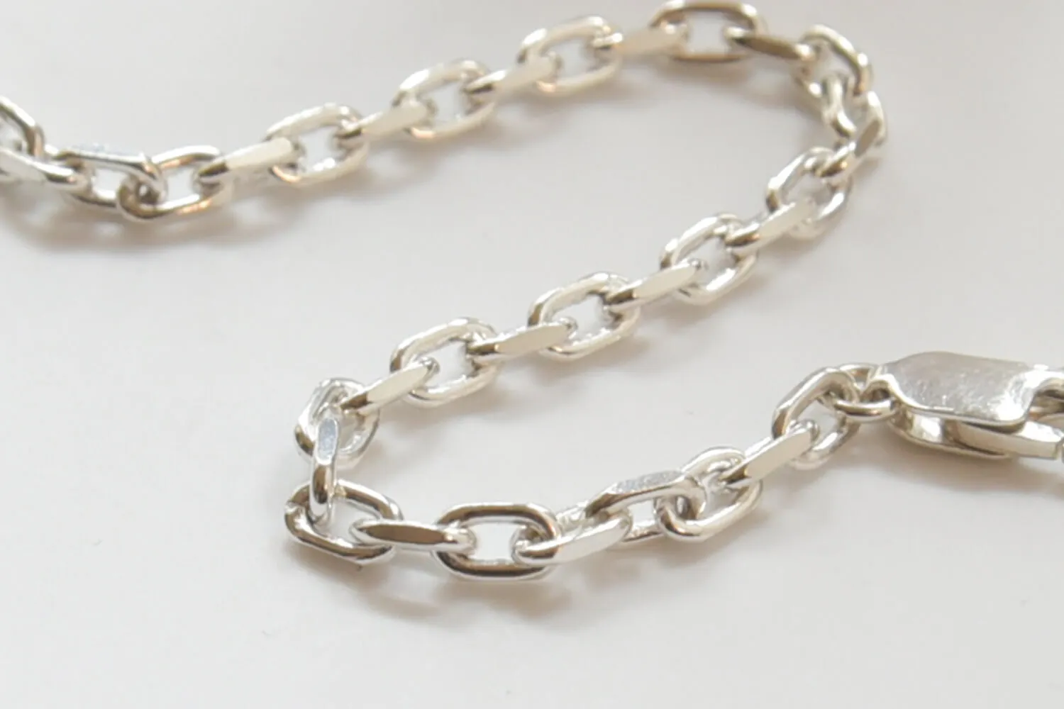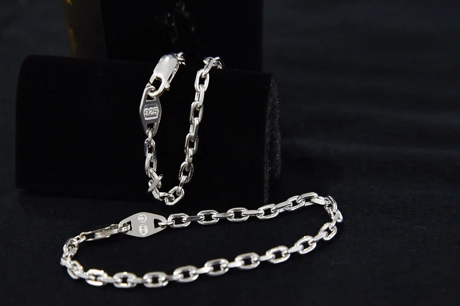 プレートとのバランスが最もよい4mmのアズキ型が連なる2面カットチェーンで仕上げています。