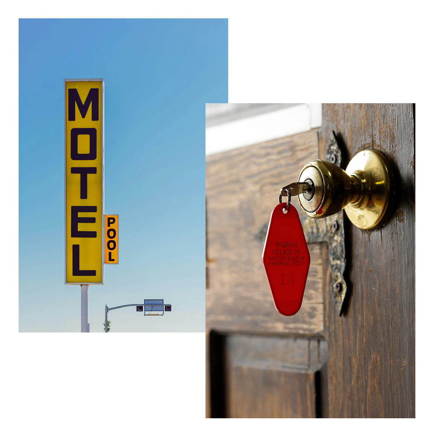 映画やドラマに登場するモーテル (街道沿いに建っているホテル)で使われているひし形のキーホルダー。実際に海外旅行や、国内の旅行でも使ったという方もいるでしょう。