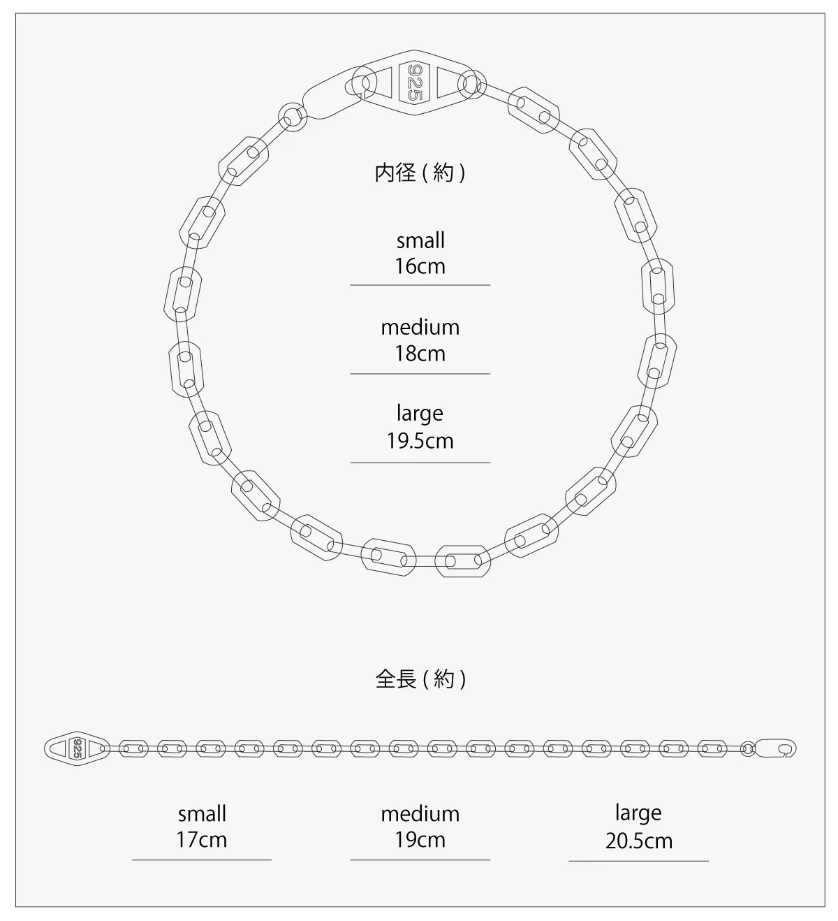 手首の細い部分を一周測り、プラス1.5cm程度の内径のものを選んでいただくと程よいサイズ感になります。