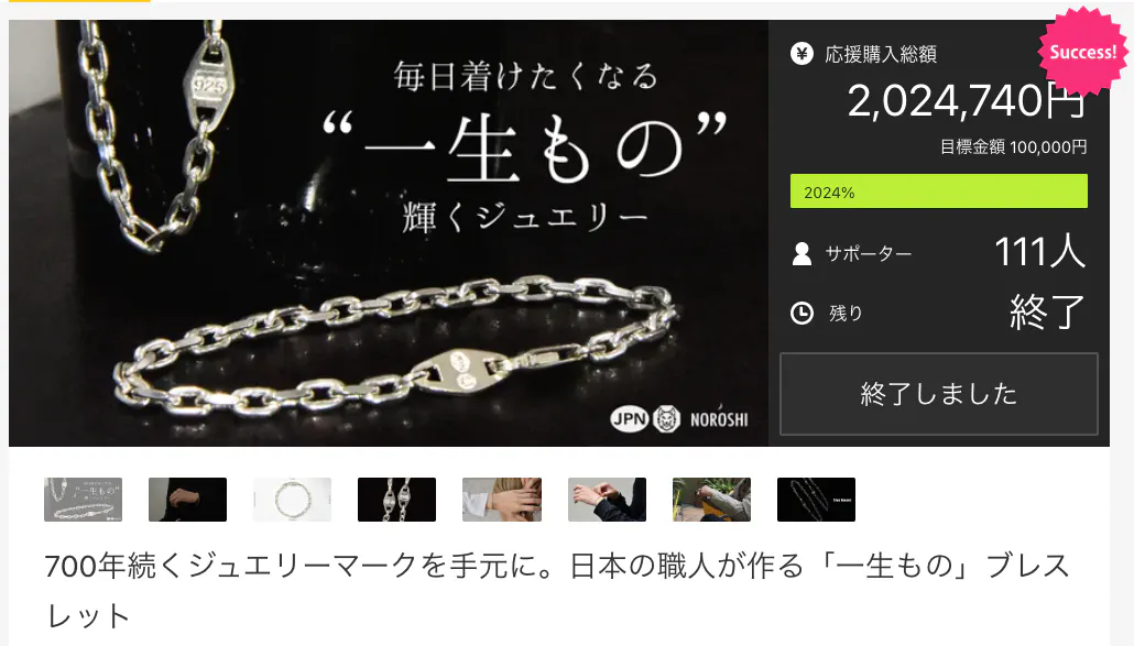 2025/01/09 10:35サポーターの皆様。今回は私たちのプロジェクトをご支援いただき誠にありがとうございました!700年続くジュエリーマークを手元に。日本の職人が作る「一生もの」ブレスレット。当プロジェクトはCampfireでの実施日程を終了いたしました。今回はAll in 方式となっておりますため、ご支援いただいたサポーターの皆様には記載の日程でのお届けを予定しております。詳細の納期日時は改めてご連絡させていただきたく思います。お届けまでもうしばらく、楽しみにお待ちいただけますと幸いでございます。NOROSHI もっと見る