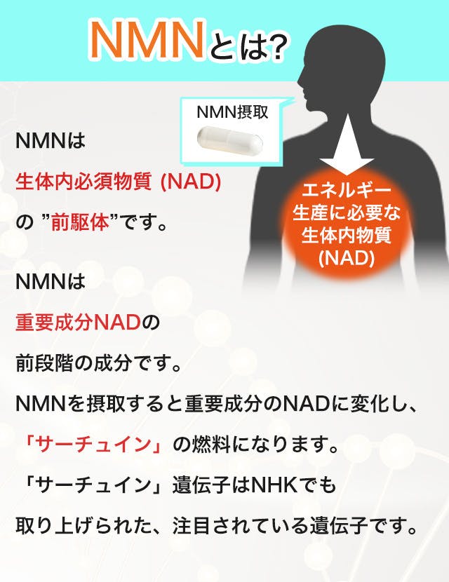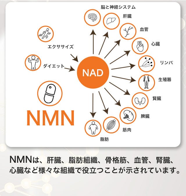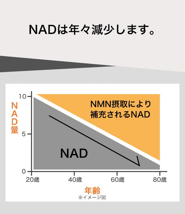 そこで、NMNを補充することが重要になります。NMNを摂取することで、体内でNADを増加さ せ、若々しさを保つためのサポートが可能となります。