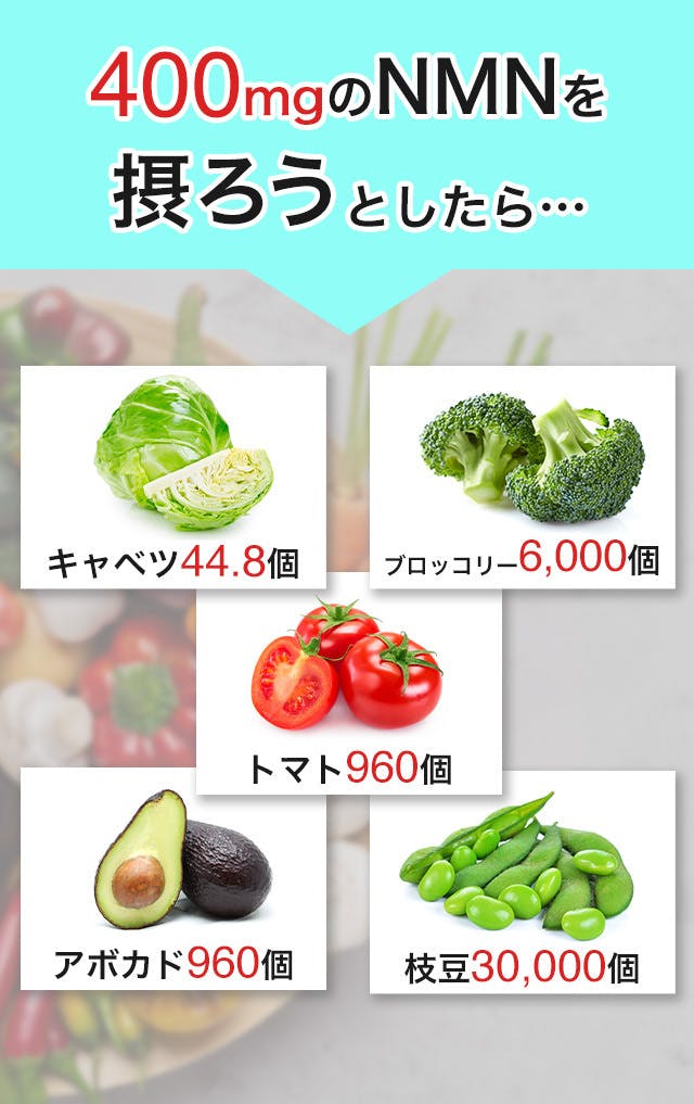 この量を毎日摂取 することは現実的ではありません。そこで、我々のNMNサプリメントは、1粒でこ れらの大量の食品に含まれるNMNを簡単に補充することができます。