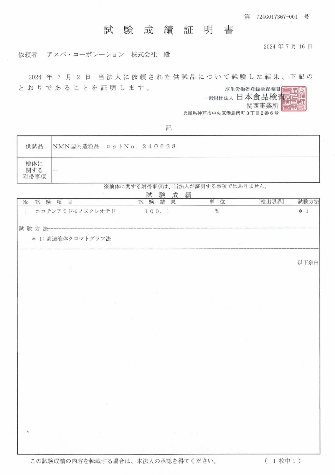 (外部分析機関、原末検体において100.0%を示す試験成績証明書、当該法人の承認を得て掲載)