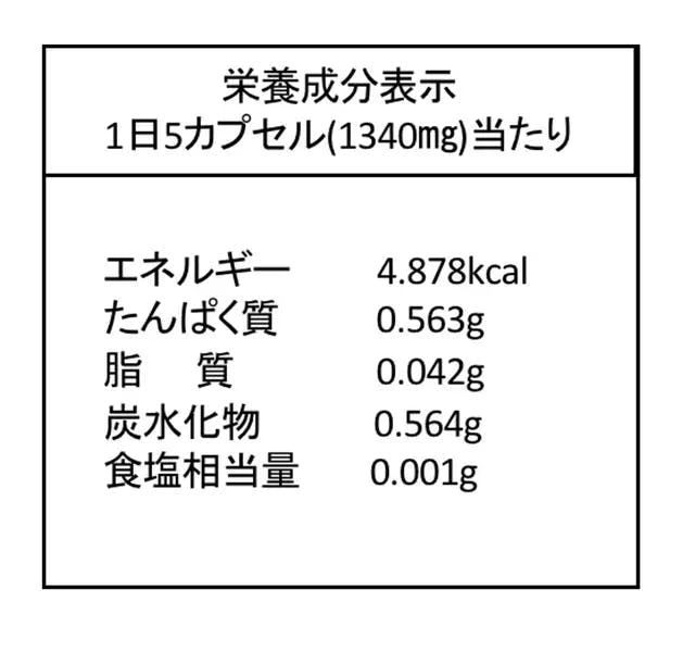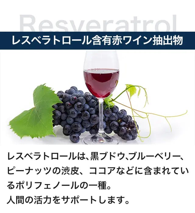 原材料名:β-ニコチンアミドモノヌクレオチド(国内製造)、デキストリン、スピルリナ原末、赤ワイン抽出物、コエンザイムQ10、植物性乳酸菌(殺菌)、植物プラセンタ(メロン胎座)/HPMC、ステアリン酸Ca、ビタミンE、ビタミンB₁、(一部に大豆を含む)
