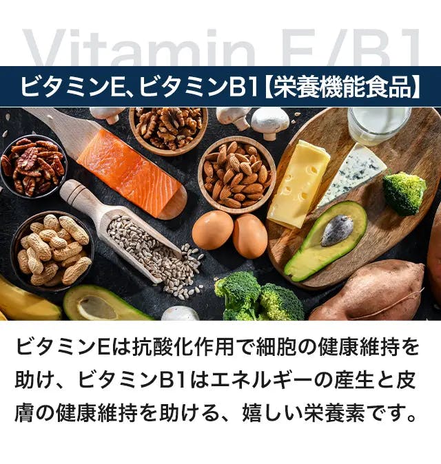 1日当たりの摂取目安量に含まれる機能の表示を行う栄養成分の量の栄養素等表示基 準値(18歳以上、基準熱量2,200kcal)に占める割合:ビタミンB1 30% ビタミンE 30%
