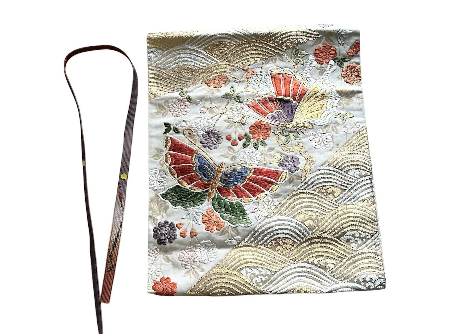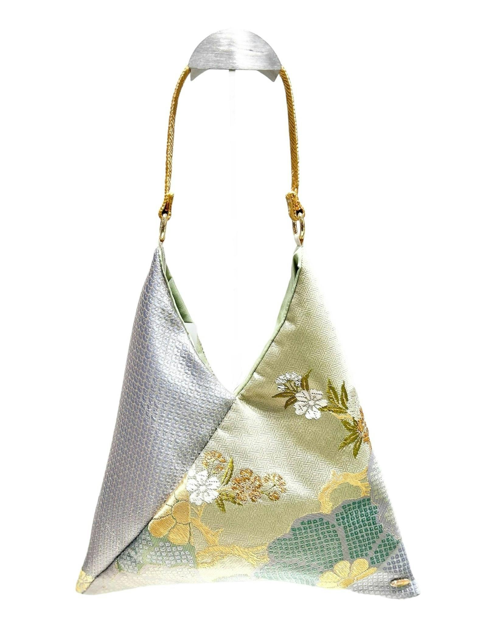 日本の伝統的な「あずま袋」をモチーフに、古い帯をアップサイクルして作られました。