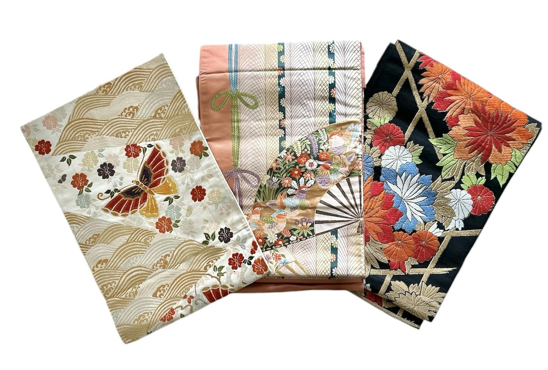 サイズについて : 帯は1つ1つ厚みが違いますし、織や刺繍や、厚みのある帯などはサイズが少し小さくなったりするなど、多少サイズの誤差が生じる場合があります。どうぞご理解の程、お願い申し上げます。