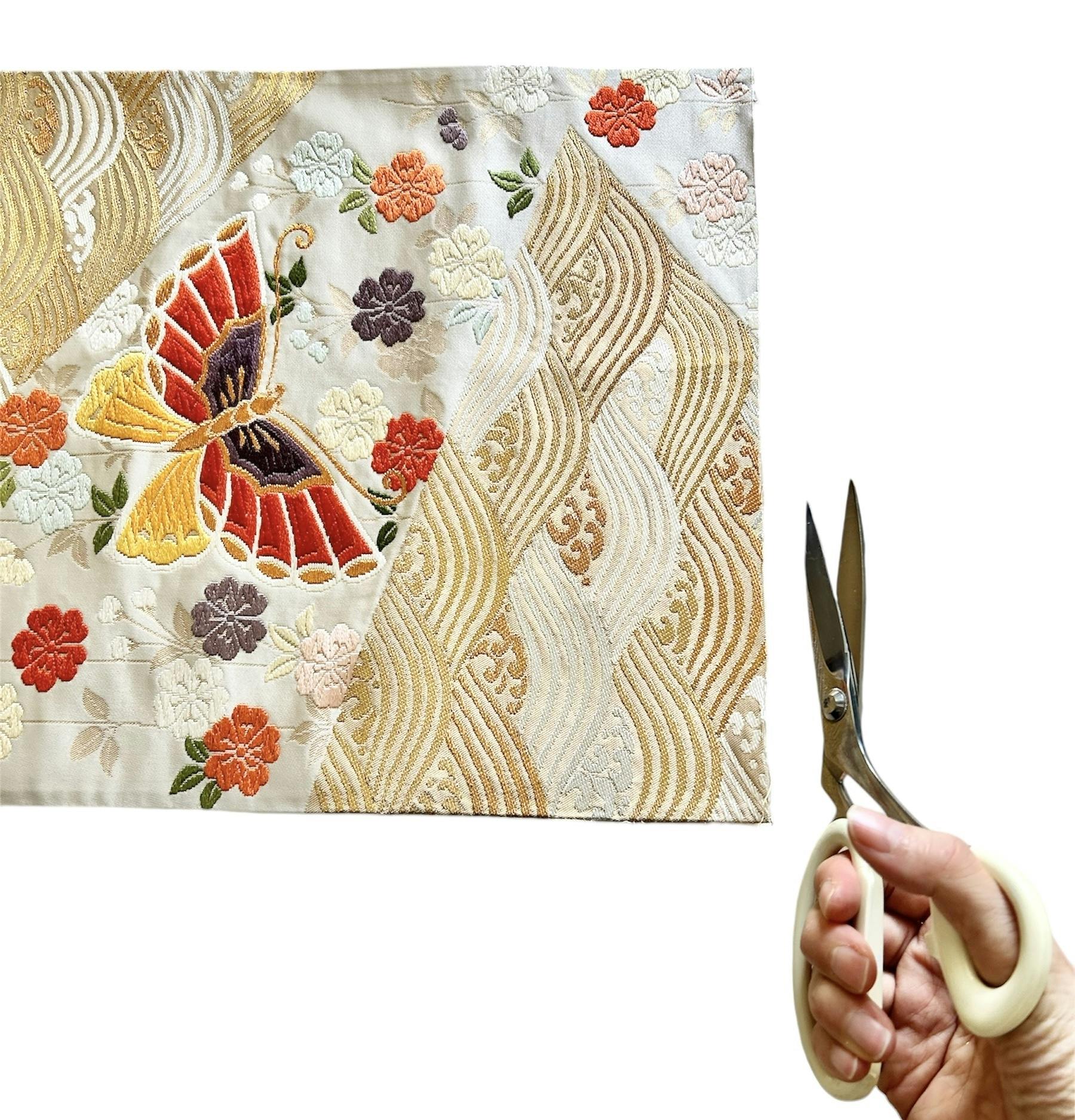 生地について : 使用している着物や帯や帯締めは以前使われていた、またはストックしていたものを使用しています。よって折りジワや小さなシミや汚れや傷や劣化などある場合があり、注意を払ってそれらを除いて使用はしておりますが、まれに残っているものもございます。時間の経過や古い時代のもの、新品ではないものをリサイクルし、アップサイクルしている、ということをご理解のほど、どうぞ宜しくお願い申し上げます。