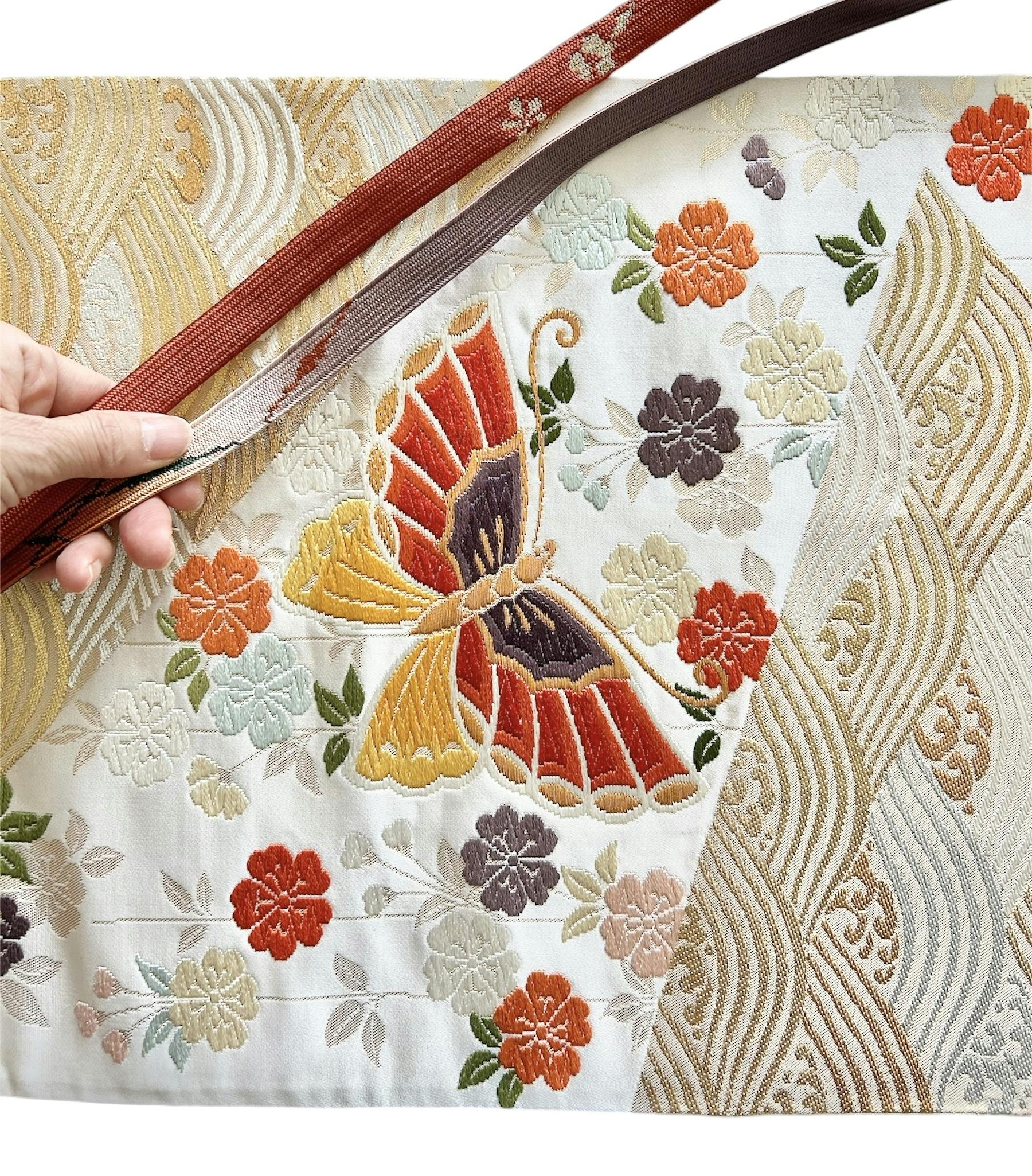 持ち手は、帯がバッグになった時により良く見えるように帯締めを使い、雰囲気や色をあわせています。