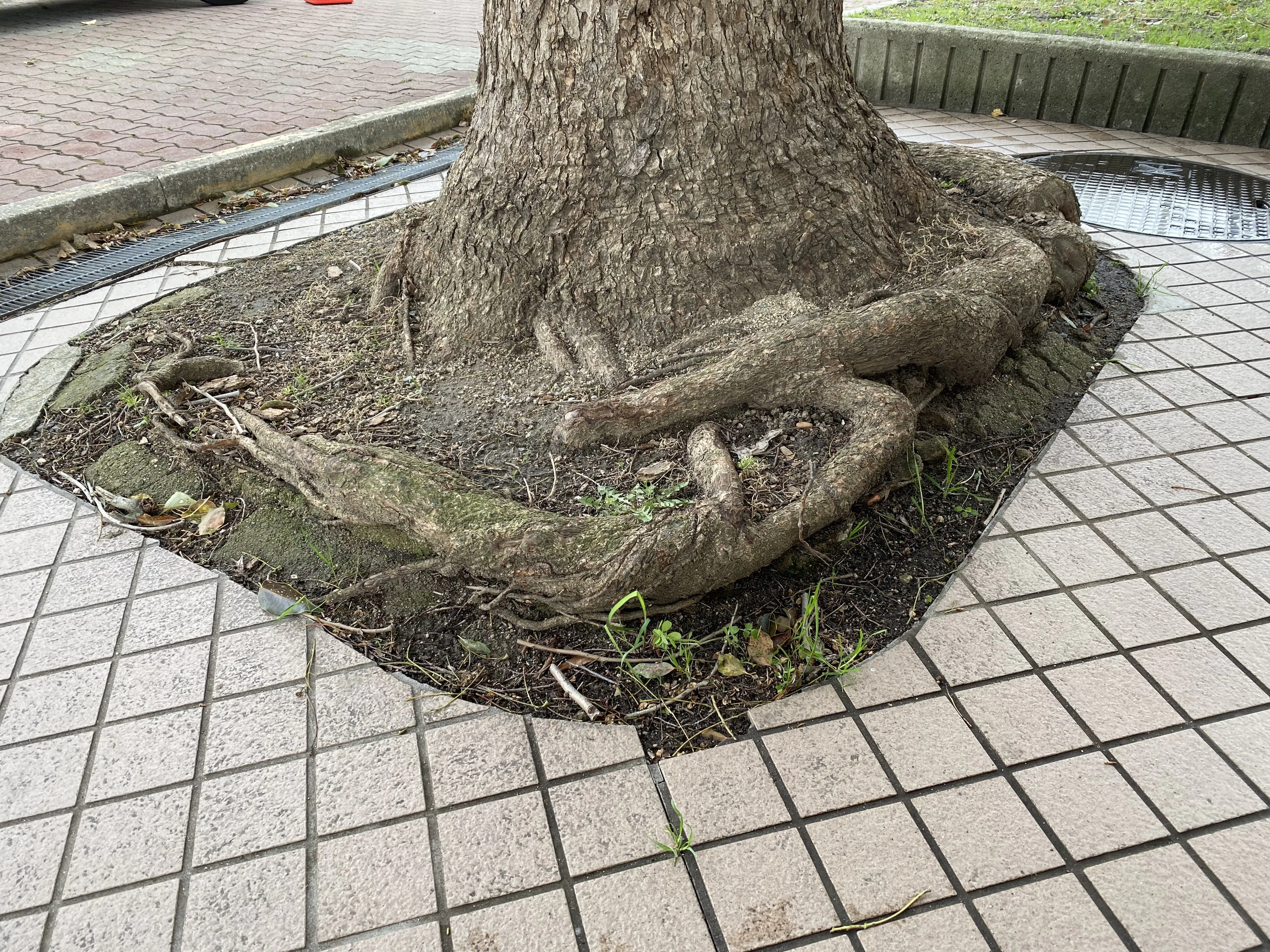 こちらの樹のようにのびのびと根を張り巡らせるのですが、街の中ですと根の張る範囲が縁石などで制限されてとても窮屈な姿になります。