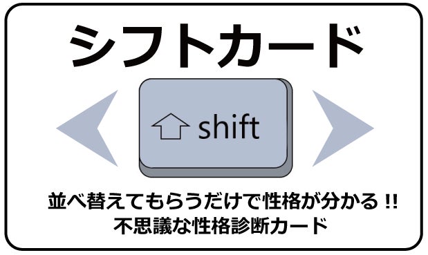 ・5枚のカードを並べ替えてもらうだけで相手の性格がズバリ分かってしまう魔法のようなツールを新たに開発します。その名はShiftカード!! 何に使うかはあなた次第。占い師にもなれるし、営業ツールとしても使えます。接客前にやってもらえば、成約率が高まります。採用面接で使えば、時間がかかる性格診断をしなくてもその場ですぐに結果が分かります。人間関係で悩んでいる人はその悩みが解放されます。