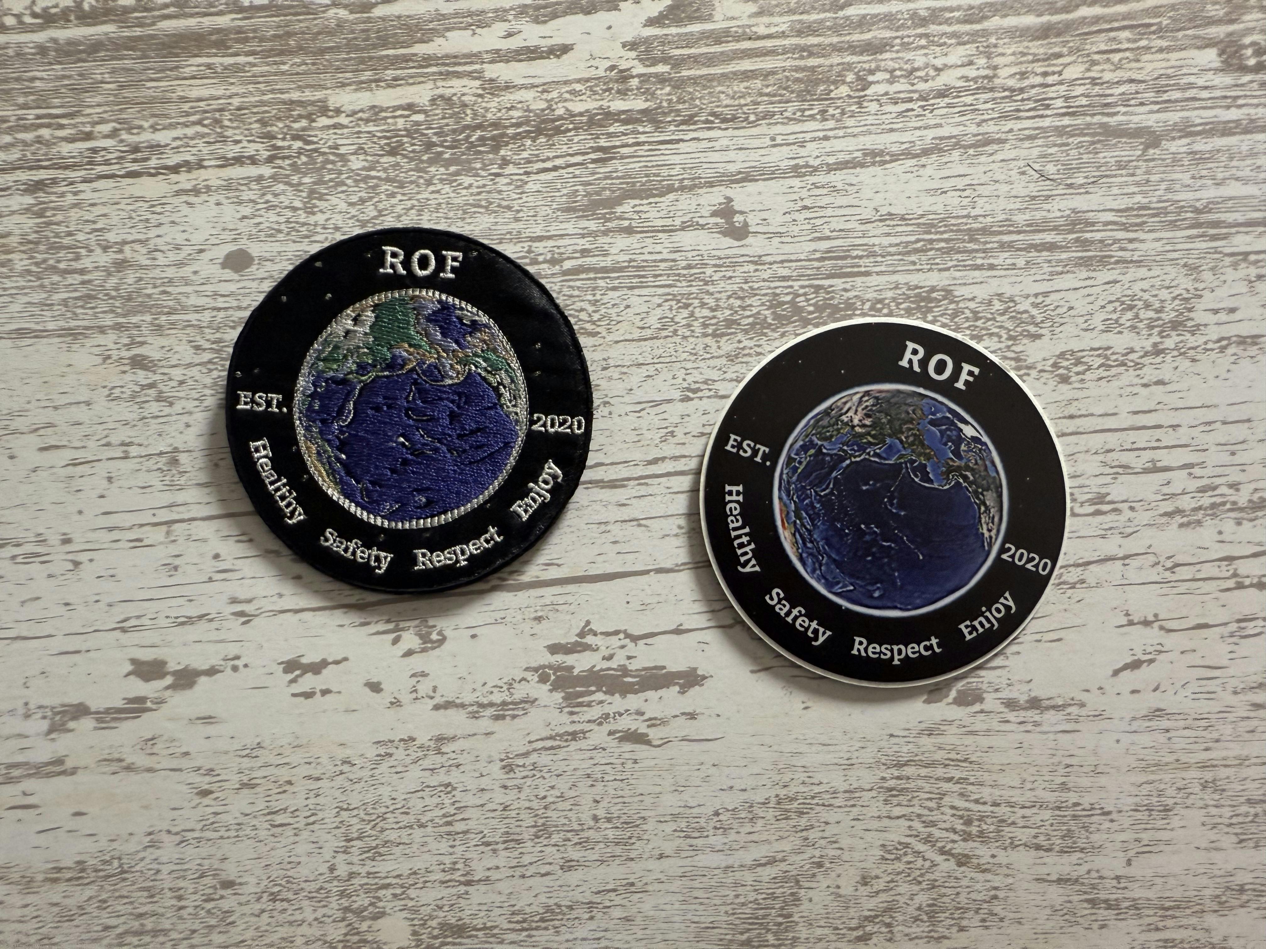 ROFの地球ワッペンと地球ステッカー。地球の周りを取り巻く白はオゾン層を表現していた!