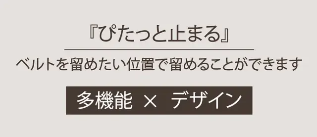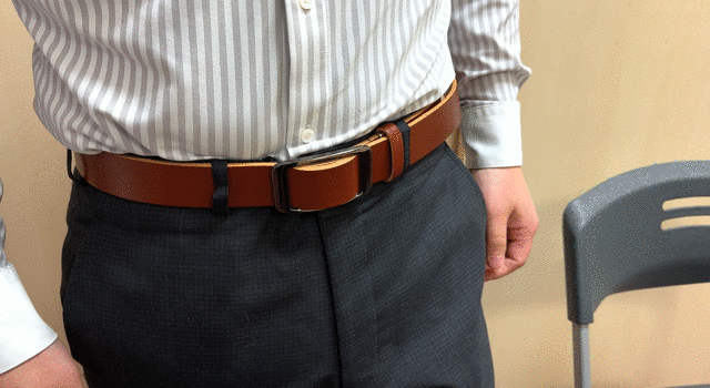 その秘密は、このベルトには従来ベルトにはある「ベルト穴」「バックルピン」がありません。