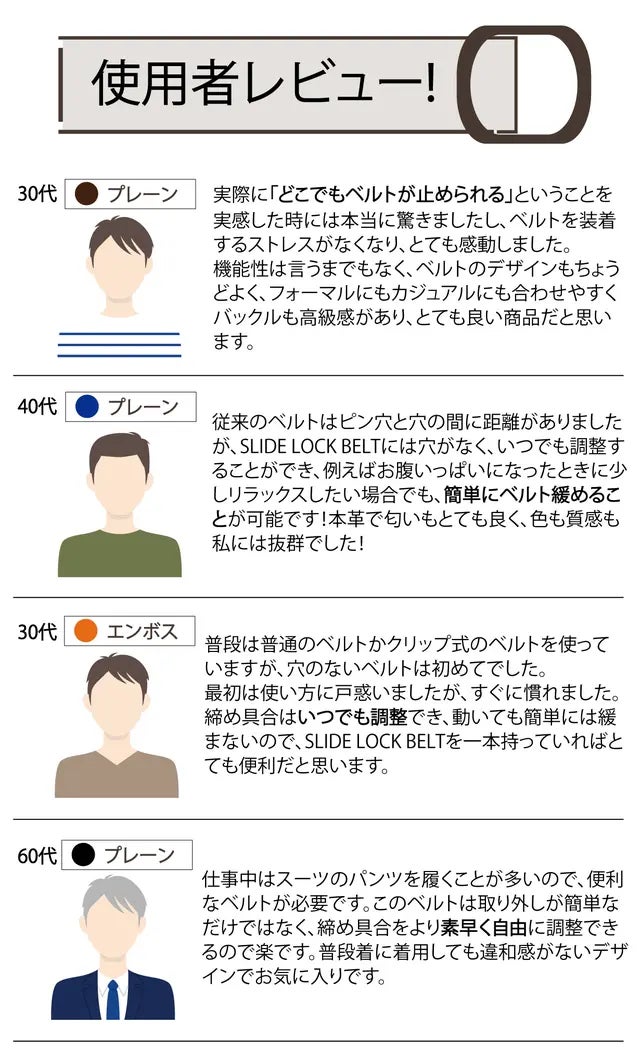 帯のデザインは「ベーシックプレーン」と「クラシックエンボス」の2種類のレザーを特別に発売。カラーも5色からお選びいただけます。普段使いからフォーマルまで、男性にも女性にも、幅広い年齢層のたくさんの皆様に、毎日のコーディネートに気軽に合わせていただける、そんなベルトはSLIDE LOCKにお任せください。