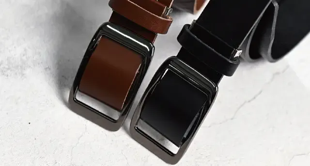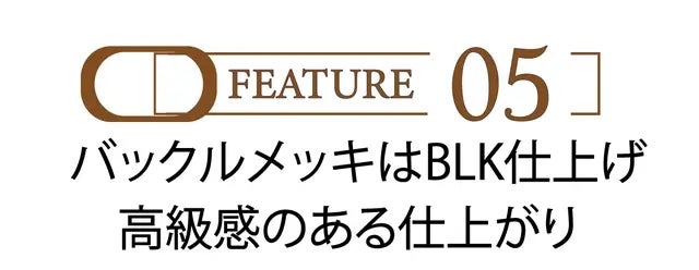 SLIDE LOCK BELTは、一般的なシルバー光沢メッキとは異なり、バックルのメッキに「BLKニッケル」メッキを採用しました!黒の光沢が落ち着いた高級感を演出しています。革の質感との相性も抜群で、ベルトの存在感を引き立てます!