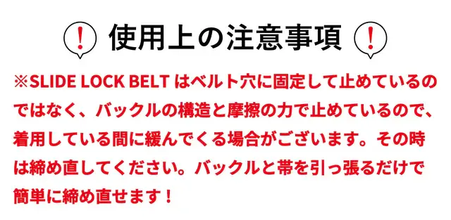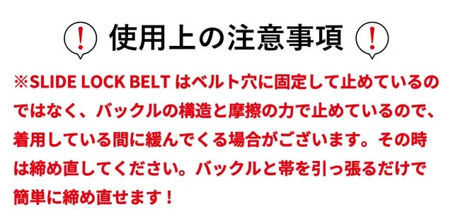「SLIDE LOCK BELT」を使用すればサイズ微調整が可能となり、このようなお悩みも簡単に解消できます!