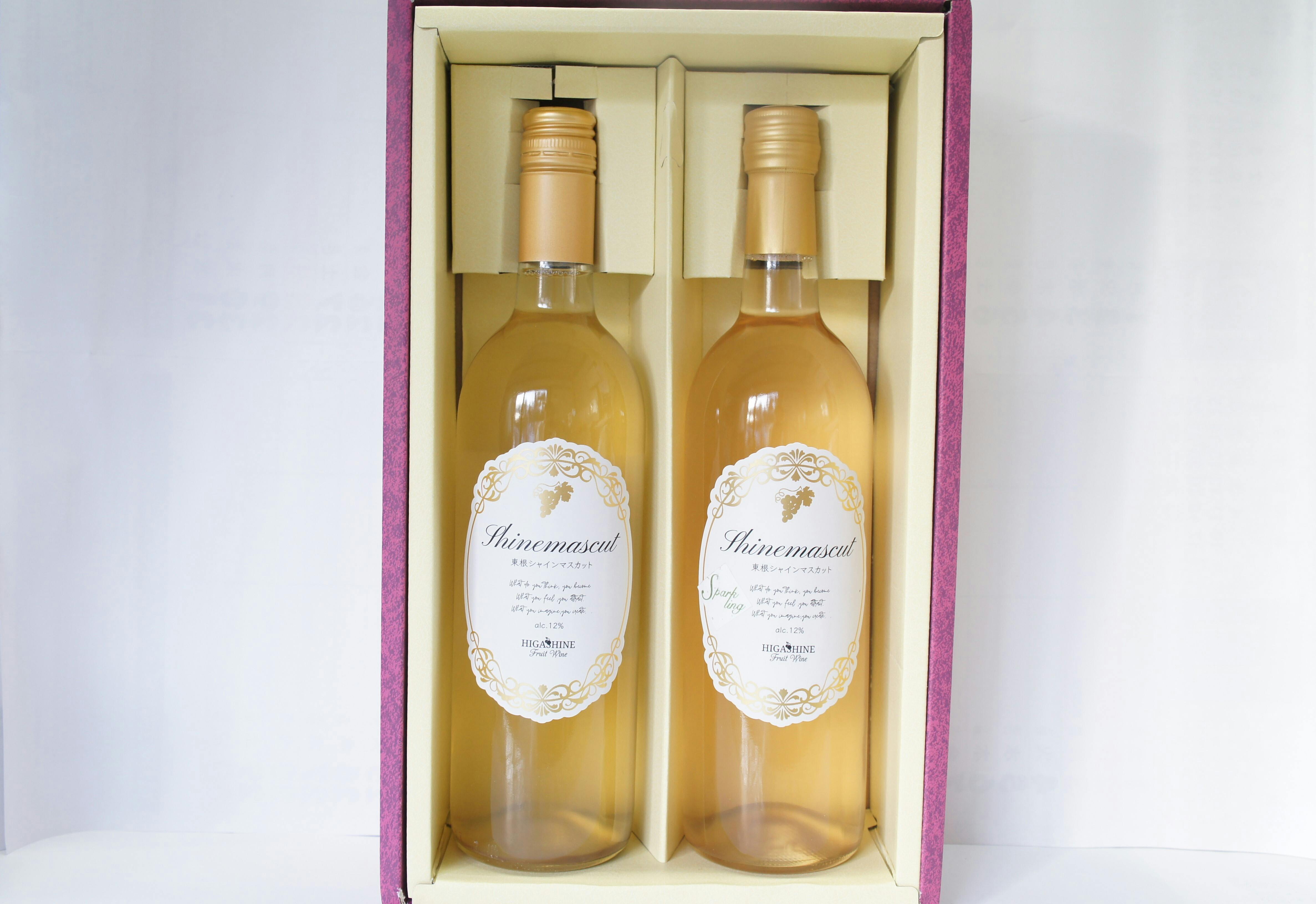 (シャインマスカット2024,750ml 1本 + シャインマスカットスパークリングワイン750ml 1本ずつ合計2本を化粧箱入りでお届します。)