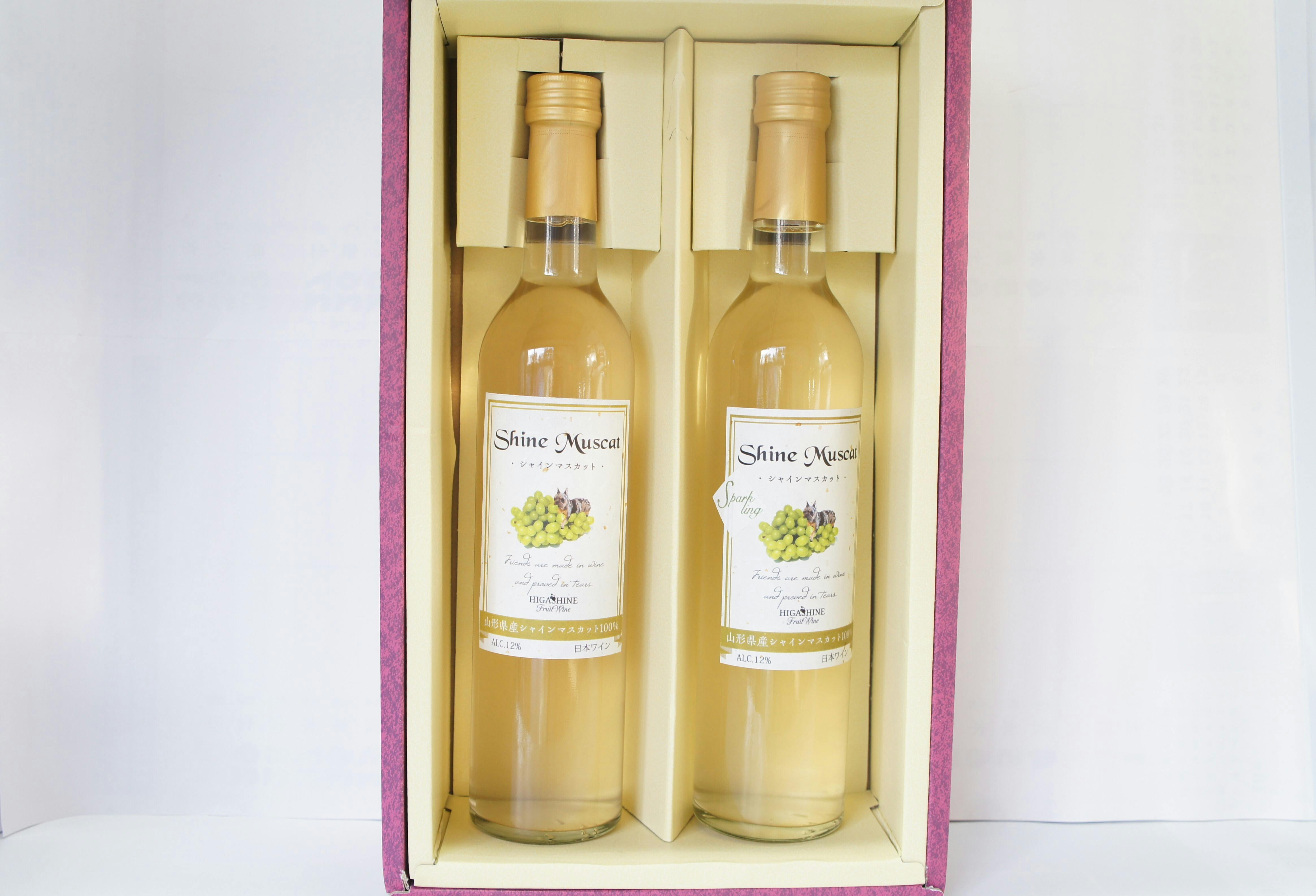 (シャインマスカット2024,500ml 1本 + シャインマスカットスパークリングワイン500ml 1本の合計2本を化粧箱入りでお届けします。