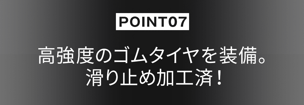 強靭なボディを支える14インチの専用タイヤは、滑り止めのついた高強度ゴムタイヤを採用。