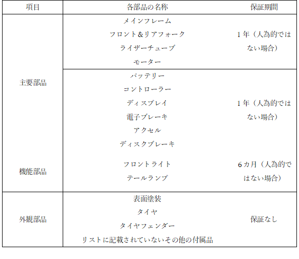 ・電動部品の電池及び主要部品(モーター、フレーム、コントローラー等)の保証は一年間となります。これら部品の保証・修理につきましては、弊社へご相談ください。