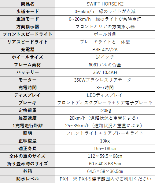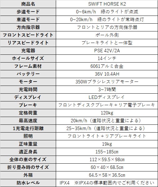 「SWIFT HORSE K2」は、電気製品です。長くお乗りいただくためには、室内や屋根付きガレージ、カバーの使用など、雨に濡れない保管場所をお勧めします。