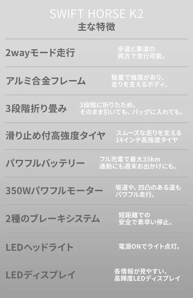 このように、未来の暮らしをあなたへお届けするSWIFT HORSE K2、その最大の魅力は、これまでの電動キックボードにはなかった、様々な新たな機能にあります。