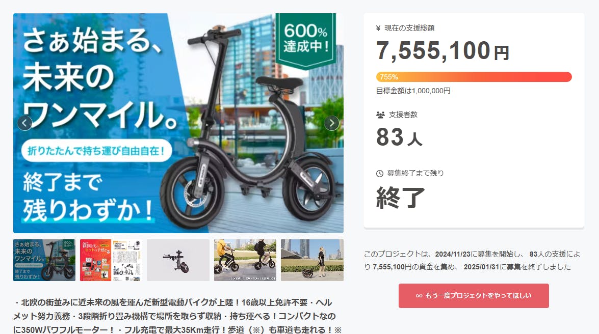 11/23から開始した本プロジェクトですが、1/31をもちまして無事終了いたしました。約2カ月間のプロジェクトでしたが、総支援者数83人、総支援金額7555100円と目標を大幅に超える結果となりました。皆様、ご支援、ご応援いただき誠にありがとうございました。