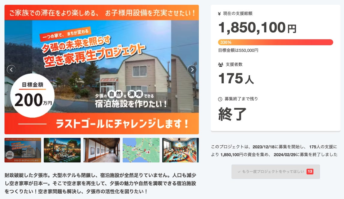 2024年2月に終了した第一弾のプロジェクトでは175人から185万円の支援を達成することができました。