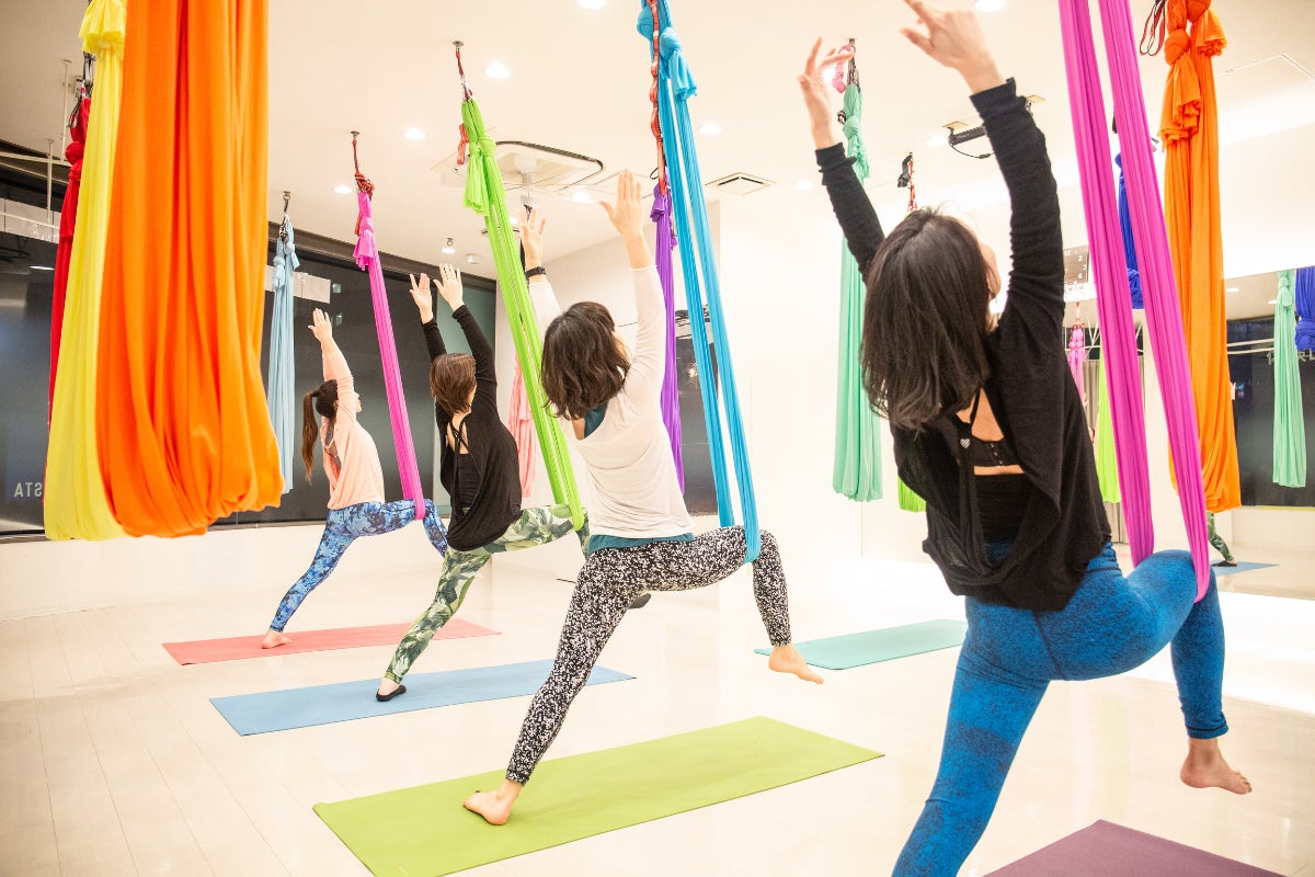 ハンモックを使用したヨガスタジオのレッスン風景