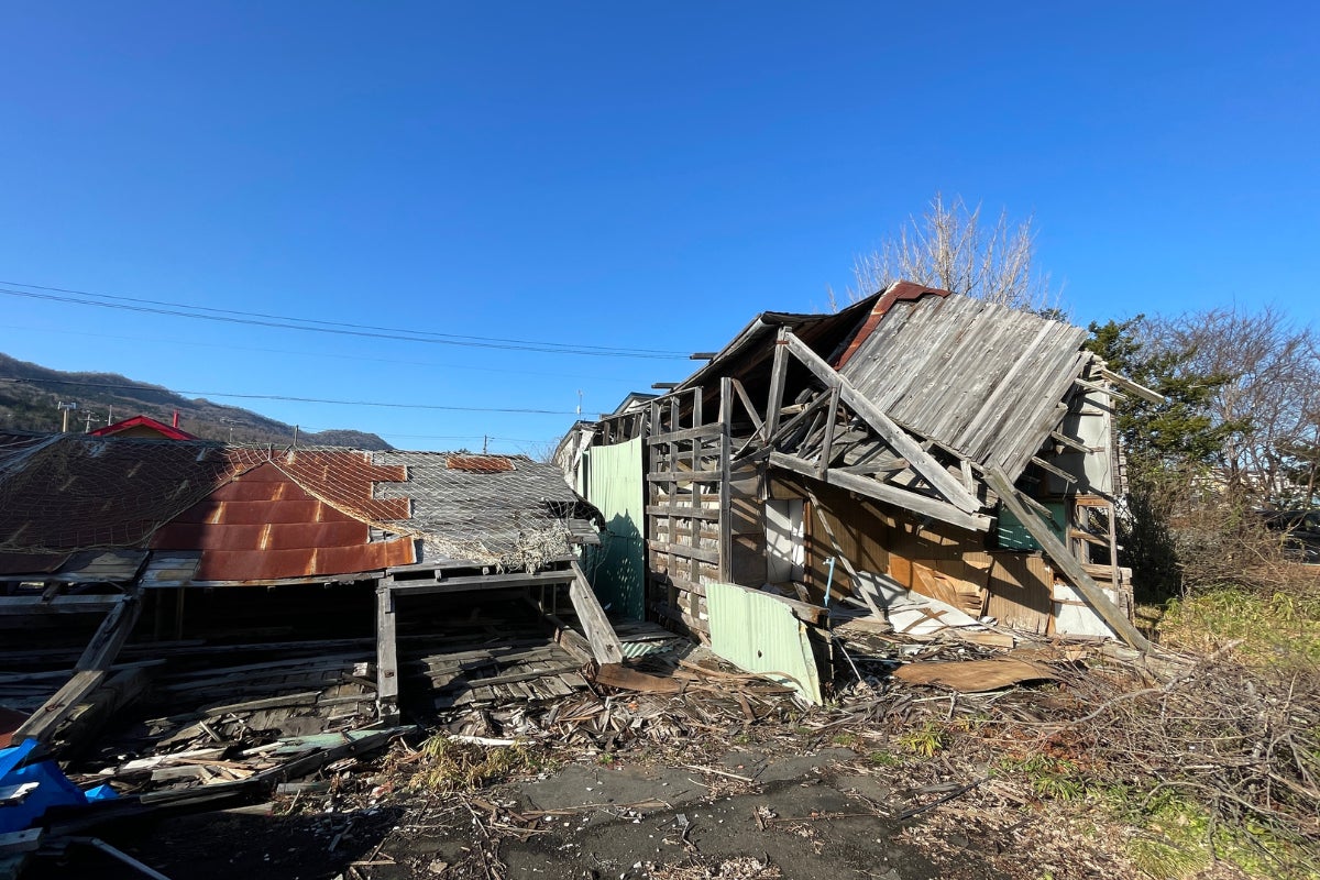 自宅の向かえの片付けられないままの倒壊した家。風の強い日には瓦礫が飛び散る危険な状況です。